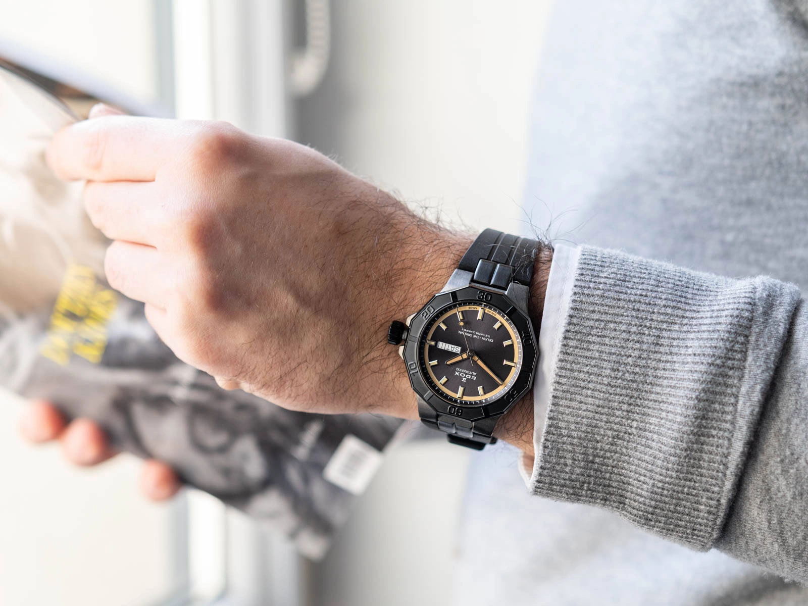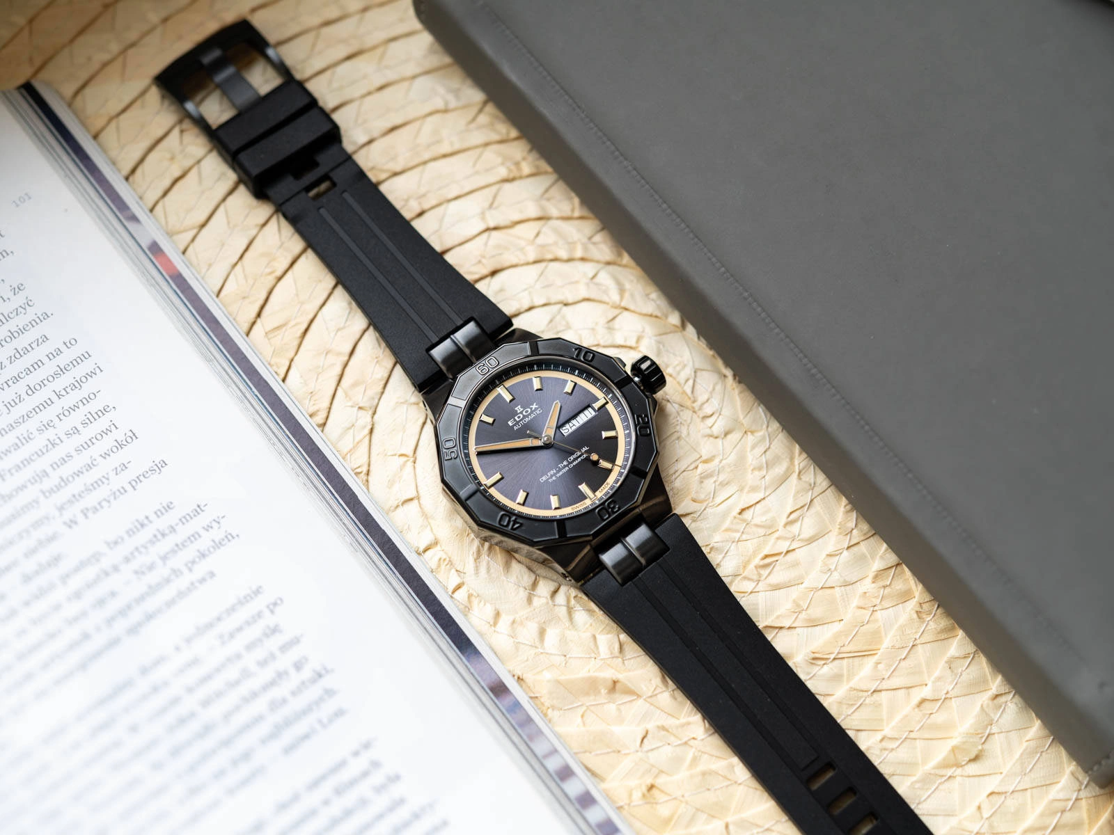 Cyferblat to harmonijne połączenie funkcjonalności i nowoczesnej estetyki. Grafitowa tarcza, ozdobiona delikatnym szlifem słonecznym, tworzy elegancki kontrast z polerowanymi indeksami i wskazówkami w odcieniach srebra i beżu. Elementy te pokryte są powłoką fosforyzującą neobrite, zapewniając doskonałą widoczność w ciemności po wcześniejszym naświetleniu. Praktyczny datownik z funkcją wskazywania dnia tygodnia oraz dnia miesiąca dodatkowo podkreśla funkcjonalny charakter zegarka. Szkiełko szafirowe, które zabezpiecza cyferblat, charakteryzuje się wyjątkową odpornością na zarysowania, co gwarantuje jego trwałość nawet przy intensywnym użytkowaniu. Koperta zegarka została wykonana z wysokiej jakości stali szlachetnej, zapewniając wytrzymałość i nowoczesny wygląd. Całość dopełnia wygodny pasek z tworzywa sztucznego, zapinany na klasyczna sprzączkę. EDOX 88008 37GNCA GBEI Delfin the Original Day Date Automatic to kwintesencja szwajcarskiego zegarmistrzostwa. Łączy w sobie niezawodność, funkcjonalność i wyrafinowany styl, który doskonale sprawdzi się zarówno na co dzień, jak i podczas specjalnych okazji. Dostarczany w oryginalnym, eleganckim pudełku producenta, stanowi doskonały wybór na prezent dla każdego mężczyzny ceniącego prestiż i jakość. To zegarek, który sprosta oczekiwaniom nawet najbardziej wymagających użytkowników, oferując im niezawodność i ponadczasową elegancję w jednym.