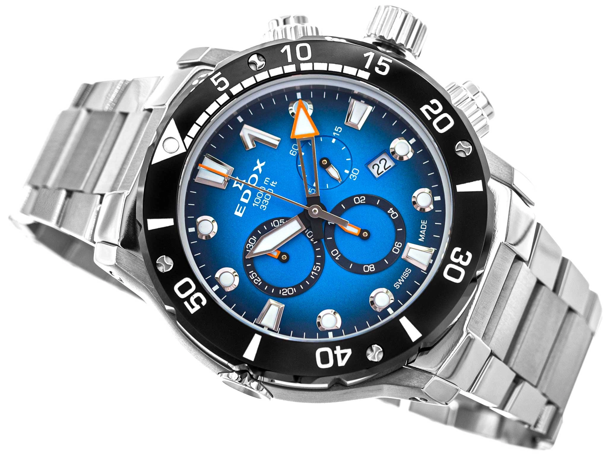 - Wodoszczelny Zegarek Męski Edox 10242 TINM BUIDN srebrny na bransolecie, posiada funkcję datownika, chronografu oraz neobrite.