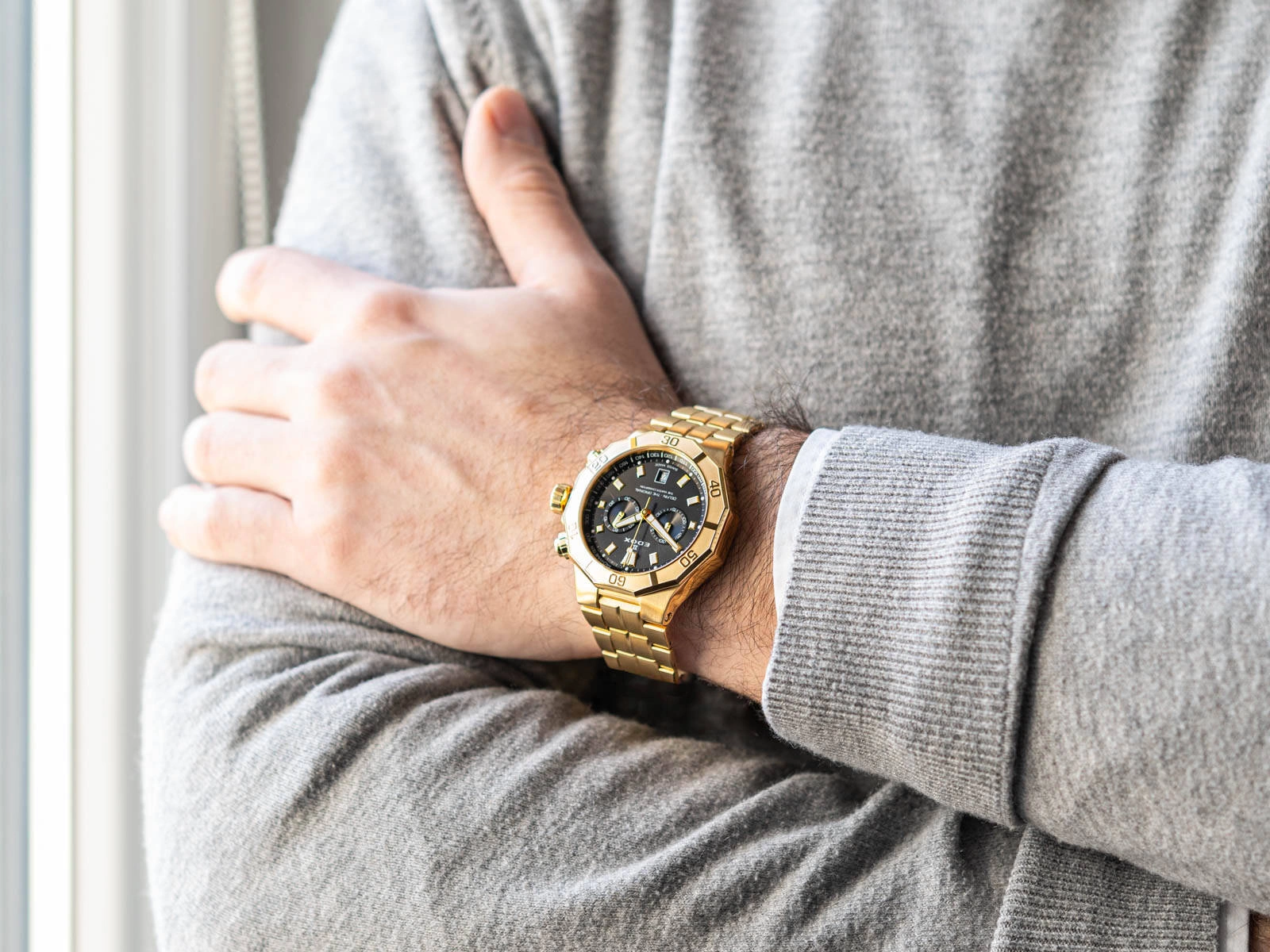- Wodoszczelny Zegarek Męski Edox 10113 37JM NID złoty na bransolecie, posiada funkcję datownika, stopera oraz neobrite.