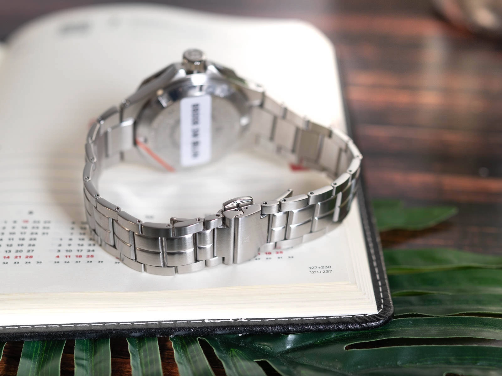 Tarcza zegarka stanowi idealne połączenie funkcjonalności i elegancji. Granatowa powierzchnia ozdobiona delikatnym szlifem słonecznym pięknie odbija światło, tworząc efekt głębi i luksusu. Wysokiej jakości polerowane indeksy oraz wskazówki w srebrnym odcieniu pokryte zostały powłoką luminescencyjną neobrite, dzięki czemu zapewniają doskonałą czytelność w ciemności po wcześniejszym naświetleniu. Na cyferblacie znalazł się również praktyczny datownik wskazujący dzień tygodnia i dzień miesiąca, co dodatkowo zwiększa funkcjonalność modelu. Całość chroniona jest odpornym na zarysowania szkłem szafirowym z powłoką antyrefleksyjną, która minimalizuje odbicia światła i zwiększa komfort odczytu godziny w każdych warunkach. Koperta zegarka została wykonana z najwyższej jakości stali szlachetnej, zapewniając trwałość, odporność na korozję oraz efektowny wygląd. Model ten wyposażono w stylową, srebrną bransoletę wykonaną ze stali szlachetnej, która idealnie komponuje się z resztą konstrukcji. Dzięki zastosowaniu podwójnego zapięcia motylkowego bransoleta gwarantuje pewne i bezpieczne dopasowanie do nadgarstka, zwiększając komfort noszenia nawet podczas intensywnych aktywności.
