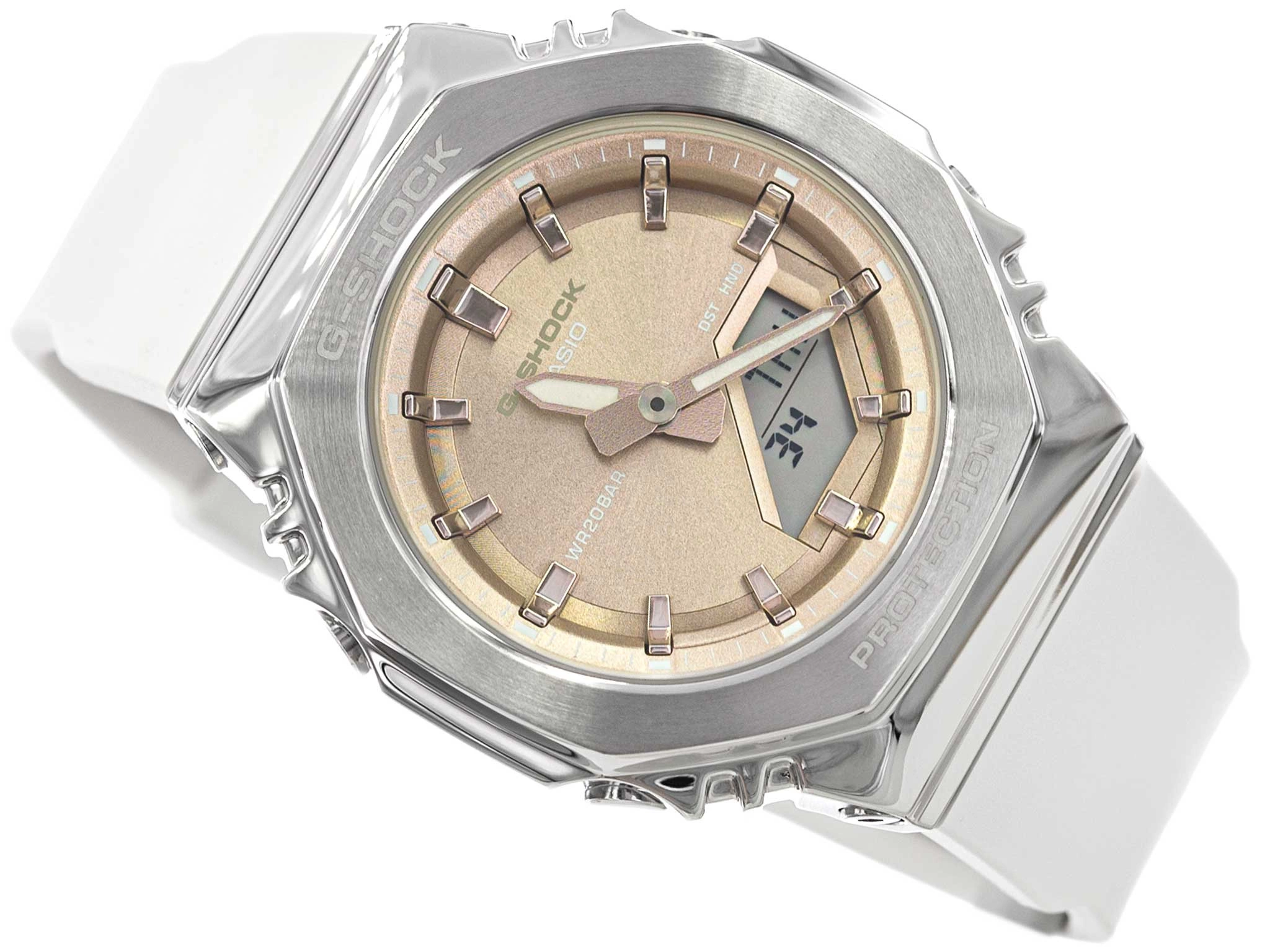 - Zegarek Damski Casio G-SHOCK GM-S2110 7A9 biały na pasku, posiada funkcje takie jak stoper i datownik.