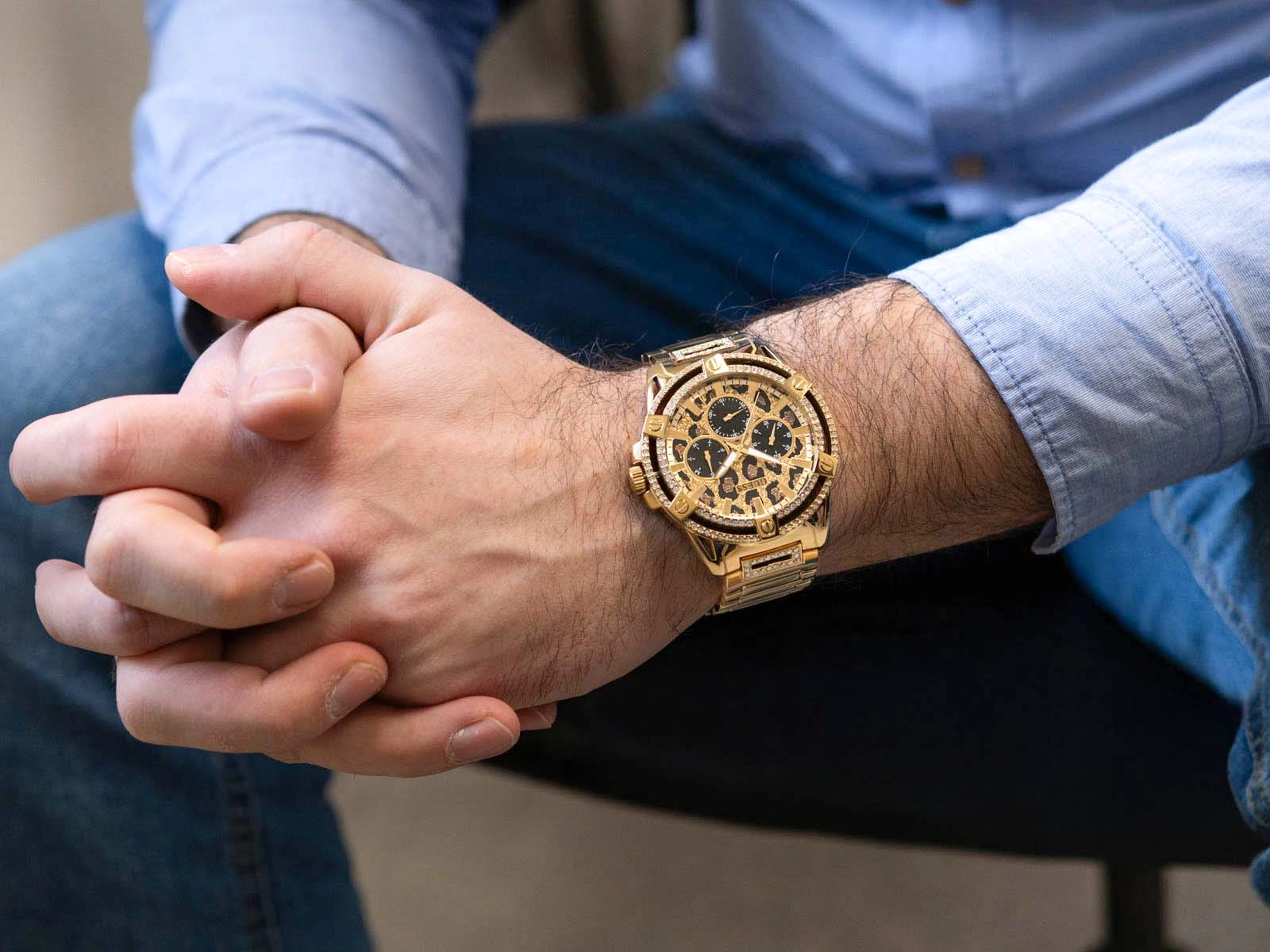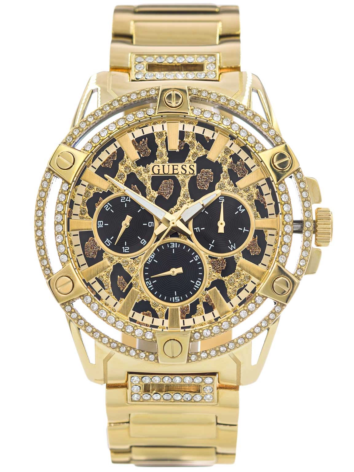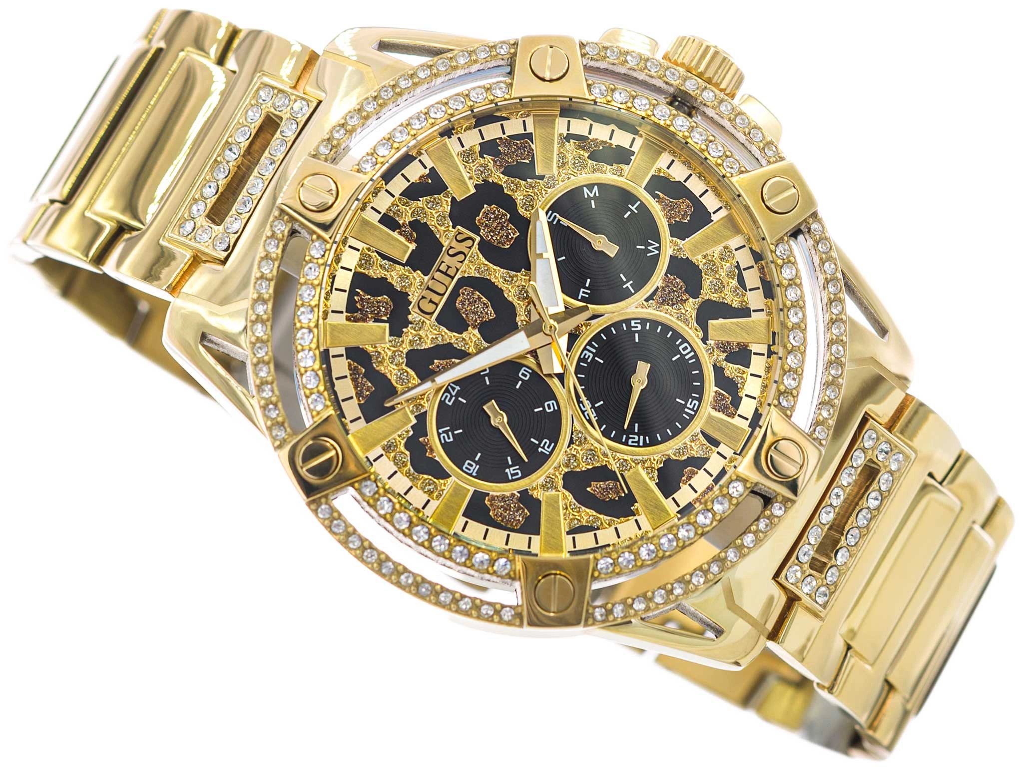 Męski zegarek Guess King GW0497G4 to doskonały wybór dla mężczyzn ceniących stylowe i modne dodatki. Wyposażony w precyzyjny mechanizm kwarcowy, działa na wymienną baterię, zapewniając bezproblemową obsługę. Jego złota tarcza, ozdobiona kryształkami, przyciąga uwagę eleganckim wykończeniem. Znajduje się na niej rozbudowany datownik wskazujący dzień tygodnia, dzień miesiąca oraz czas w formacie 24-godzinnym. Dodatkowo cyferblat zdobi zwierzęcy wzór w formie centek, nadając całości unikalnego charakteru.