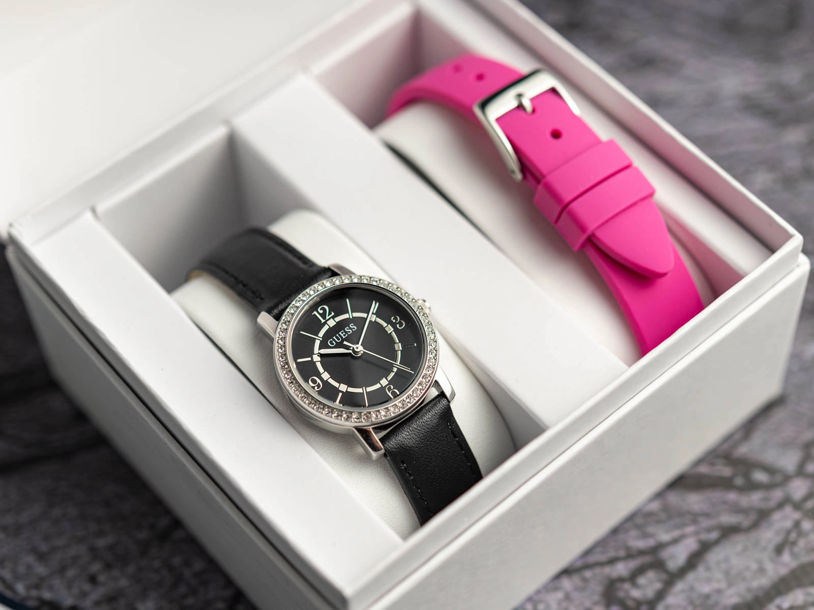 Zestaw zapakowany jest w eleganckie pudełko, idealne na prezent. Dodatkowy pasek z wysokiej jakości tworzywa sztucznego w odcieniu różu umożliwia łatwą wymianę dzięki systemowi szybkiego wypięcia. To innowacyjne rozwiązanie pozwala na dopasowanie zegarka do różnych stylizacji, zapewniając użytkowniczce pełną swobodę w kreowaniu własnego, unikalnego looku. GUESS GW0643L1 to harmonijne połączenie funkcjonalności, elegancji i nowoczesnego designu – idealne zarówno na co dzień, jak i na wyjątkowe okazje.