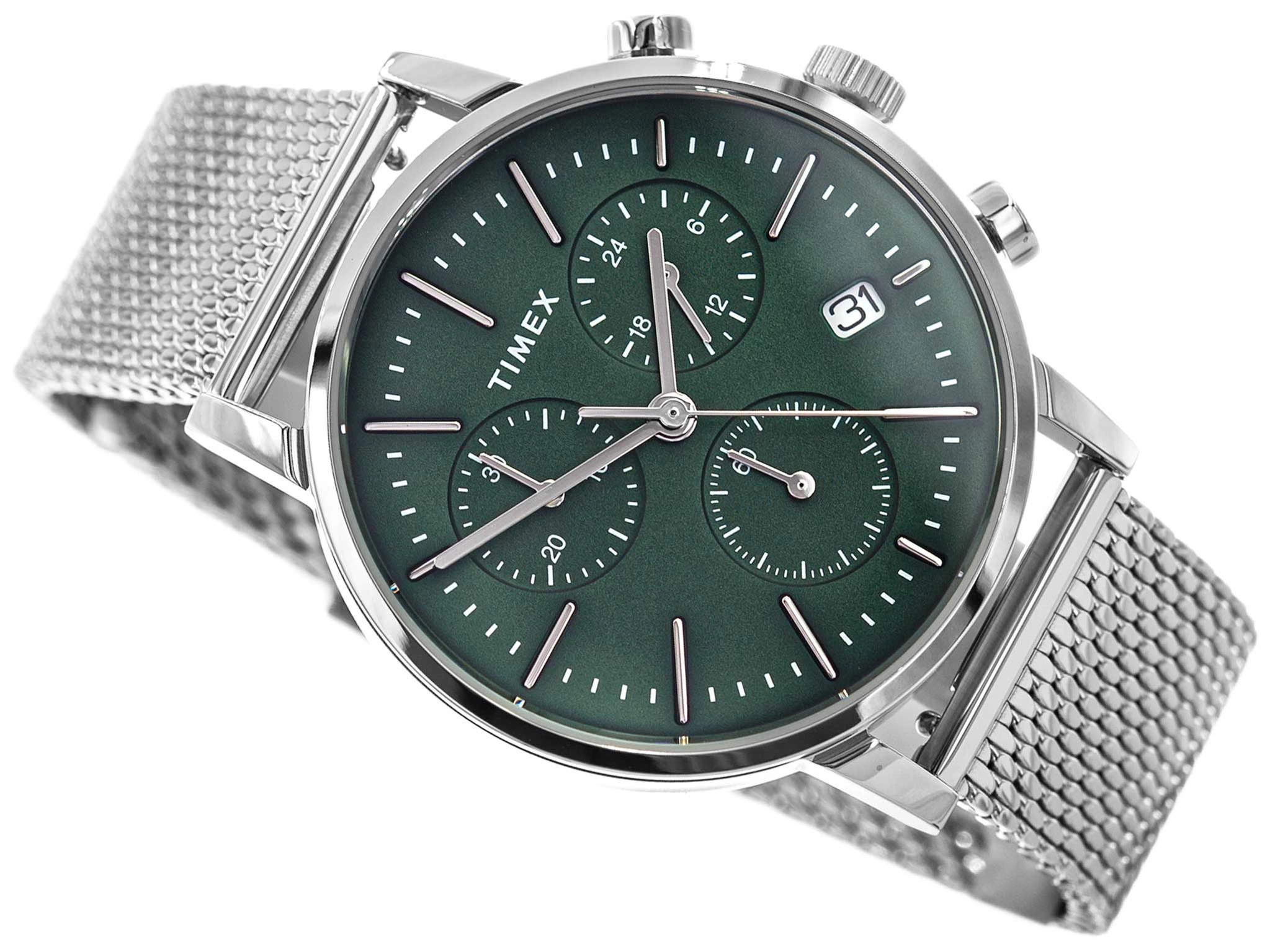 TIMEX TW2W43400 Midtown to elegancki i nowoczesny zegarek, który doskonale prezentuje się na męskim nadgarstku, dodając stylu i klasy każdej stylizacji. Wyróżnia się solidnym wykonaniem oraz funkcjonalnością, które sprawiają, że jest to idealny wybór na co dzień. Srebrna bransoleta typu mesh nie tylko nadaje zegarkowi nowoczesnego charakteru, ale również zapewnia wygodę noszenia dzięki możliwości precyzyjnej regulacji. Jej konstrukcja pozwala na samodzielne dopasowanie długości bez konieczności wizyty u zegarmistrza. Zielona tarcza to połączenie klasyki i nowoczesności. Wyraziste srebrne indeksy wyróżniają się na jej tle, gwarantując czytelność w każdych warunkach. Dodatkowo, producent wyposażył ten model w przydatny, rozbudowany stoper analogowy, który umożliwia precyzyjny pomiar czasu, oraz funkcjonalny datownik, pomagający w codziennym śledzeniu aktualnej daty.