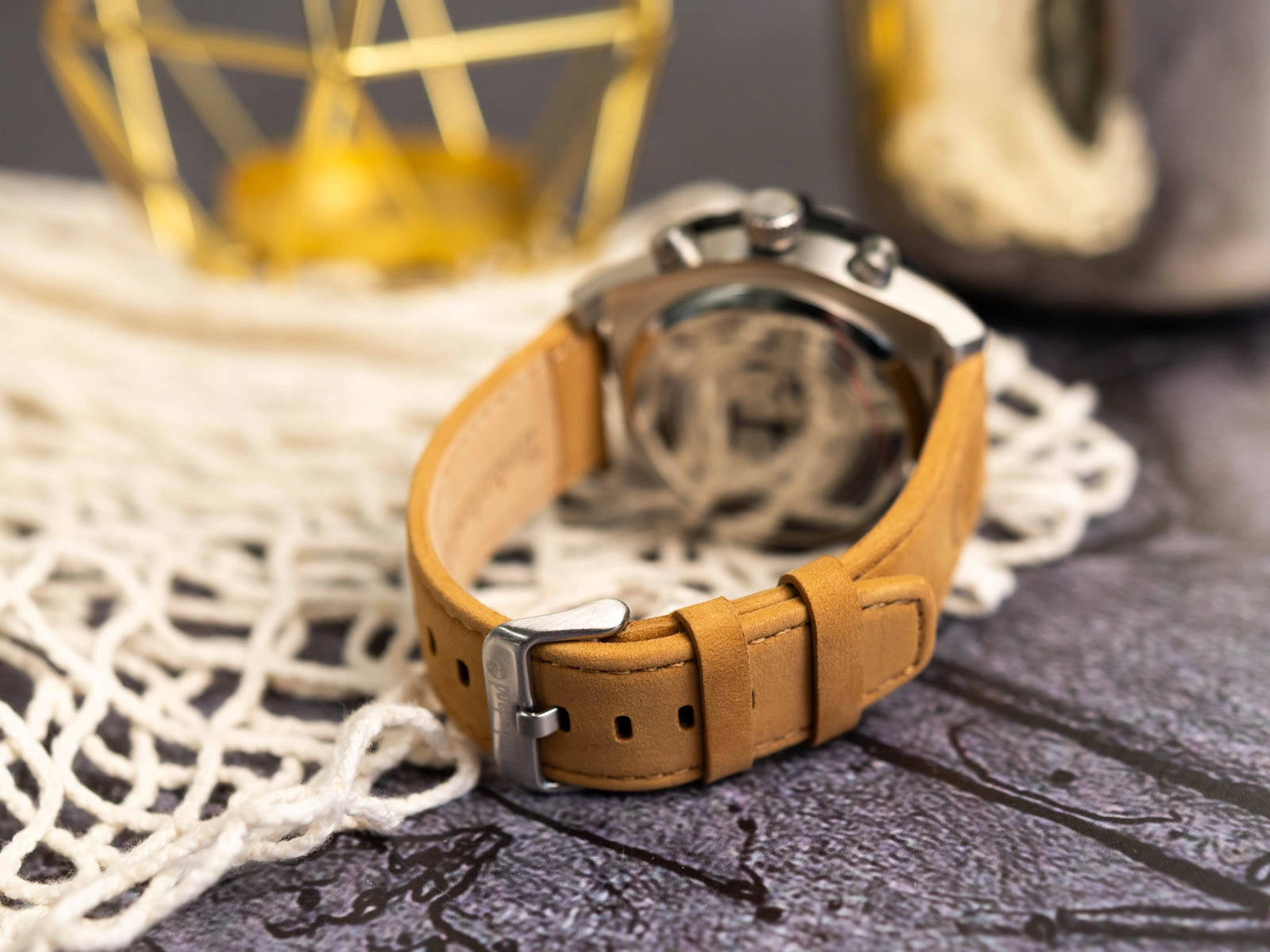 Timberland TDWGD2103202 Durham to wyjątkowy zegarek, który łączy nowoczesny design, niezawodność i ponadczasowy styl. Jego solidna koperta osadzona jest na eleganckim, brązowym pasku wykonanym z wysokiej jakości skóry naturalnej, zapinanym na klasyczną sprzączkę dla maksymalnego komfortu użytkowania.Precyzyjny mechanizm kwarcowy, zasilany wymienną baterią, zapewnia dokładność i bezproblemowe działanie na co dzień. Tarcza zegarka wyróżnia się innowacyjnym połączeniem klasycznego, analogowego wyświetlacza z funkcjonalnymi elementami cyfrowymi. Charakterystyczne logo marki Timberland dodaje mu unikalnego charakteru, a wbudowane podświetlenie ułatwia odczyt godziny nawet w trudnych warunkach oświetleniowych.