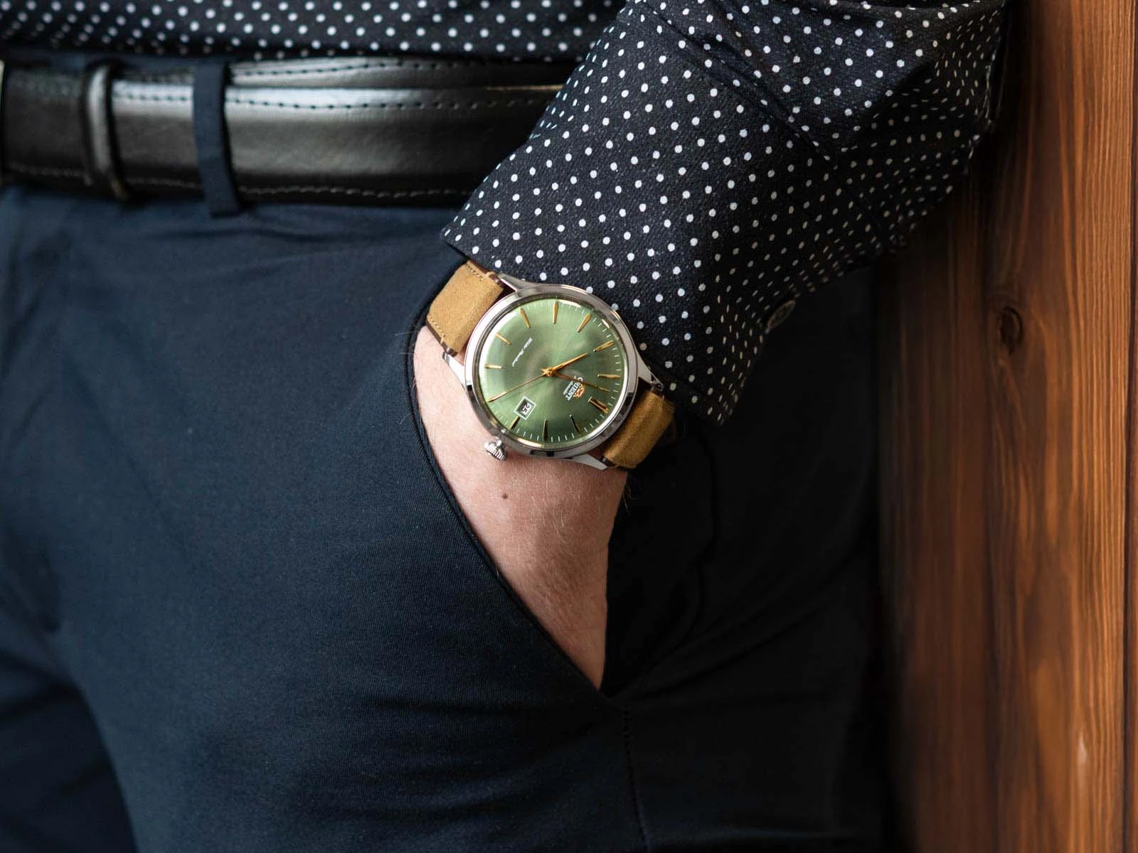 Zegarek Orient RA-AC0P01E30B Bambino Automatic to wyjątkowy przykład harmonijnego połączenia klasyki i współczesnej elegancji, które przyciąga uwagę zarówno miłośników tradycyjnego zegarmistrzostwa, jak i tych, którzy cenią nowoczesne rozwiązania. Dzięki zastosowanemu mechanizmowi automatycznemu, czasomierz ten nie wymaga baterii, gdyż jego praca opiera się na naturalnym ruchu nadgarstka. Dodatkowo, możliwość ręcznego dokręcania za pomocą koronki sprawia, że użytkownik może z łatwością kontrolować precyzję działania mechanizmu, dostosowując go do własnych preferencji. Koperta wykonana z wysokiej jakości stali szlachetnej w kolorze srebra nadaje modelowi wyrafinowanego charakteru, sprawiając, że jest on doskonałym wyborem zarówno na oficjalne spotkania, jak i codzienne sytuacje wymagające elegancji. Stylowy pasek wykonany z wysokogatunkowej skóry naturalnej w odcieniu beżu nie tylko dodaje całości subtelnego uroku, ale także gwarantuje komfort noszenia przez cały dzień. Tradycyjna sprzączka pozwala na szybkie i łatwe dopasowanie zegarka do nadgarstka, zapewniając przy tym stabilność i wygodę. Zielona tarcza ozdobiona delikatnym szlifem słonecznym, przyciąga wzrok i dodaje czasomierzowi wyjątkowego charakteru. Smukłe, złote wskazówki i eleganckie indeksy tworzą subtelny kontrast z ciemniejszym tłem, podkreślając ponadczasową estetykę zegarka. Funkcjonalny datownik umieszczony na godzinie trzeciej zapewnia wygodę w codziennym użytkowaniu, ułatwiając szybkie sprawdzenie aktualnej daty. Całość zabezpieczona jest odpornym na drobne zarysowania szkłem mineralnym, które gwarantuje doskonałą przejrzystość i trwałość. Każdy detal tego modelu został starannie przemyślany, aby połączyć tradycyjną sztukę zegarmistrzowską z nowoczesną funkcjonalnością. Eleganckie opakowanie, w którym zegarek jest dostarczany, sprawia, że stanowi on idealny pomysł na prezent dla osób ceniących klasykę w najlepszym wydaniu. Orient RA-AC0P01E30B Bambino Automatic to zegarek, który nie tylko odmierzania czas, ale także podkreśla indywidualny styl swojego właściciela, będąc symbolem doskonałego gustu i dbałości o detale.