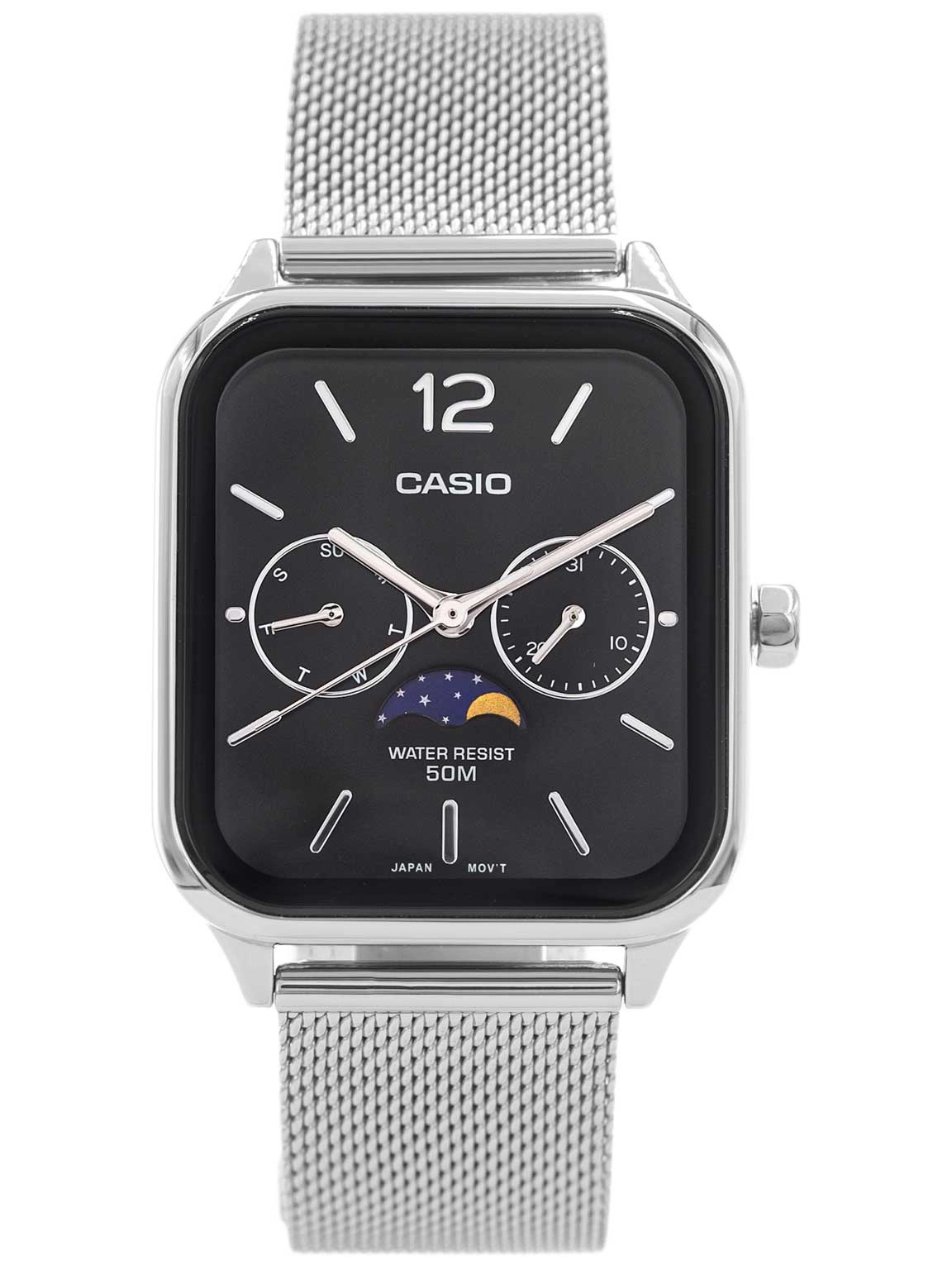 • Wodoszczelny Zegarek Męski Casio MTP-M305M-1AVER srebrny na bransolecie, posiada funkcję datownika oraz wskaźnik faz księżyca