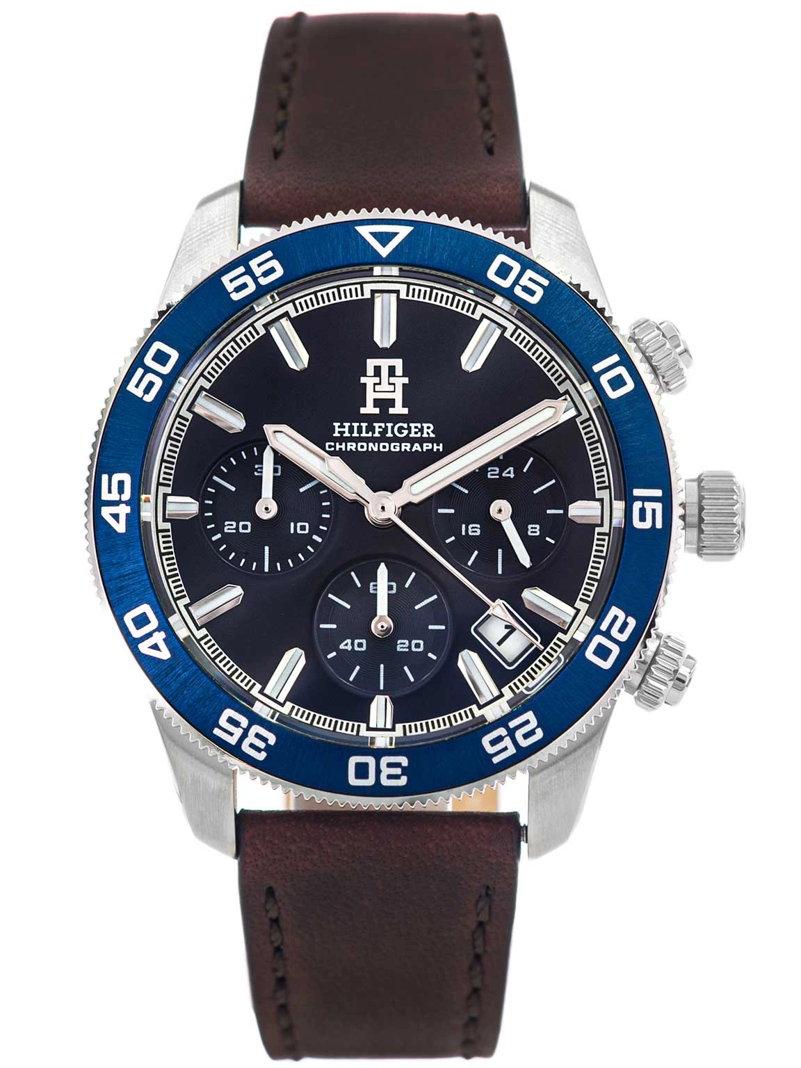 - Zegarek Męski Tommy Hilfiger 1792163 brązowy na pasku, posiada funkcję datownika, stopera oraz neobrite.