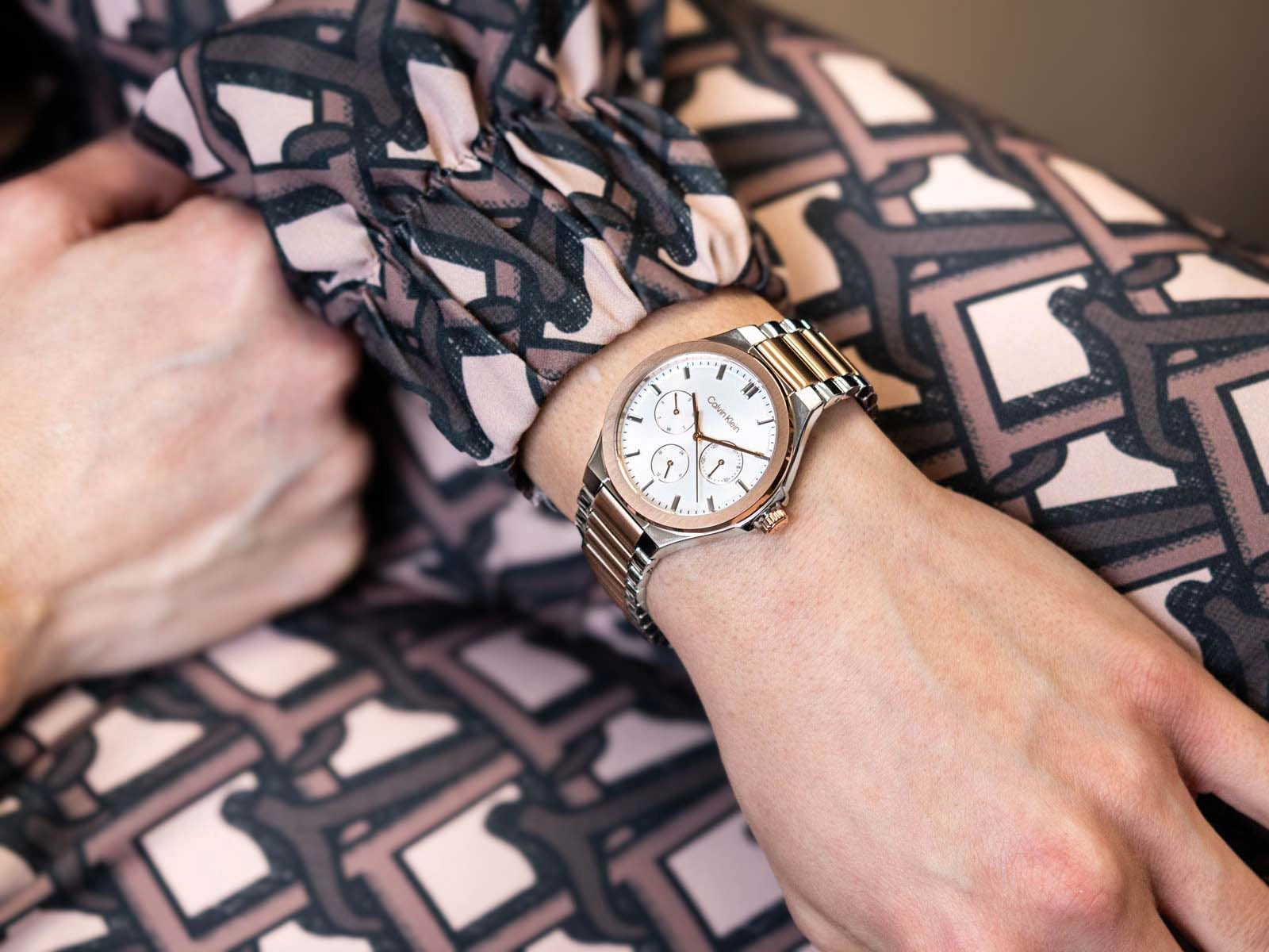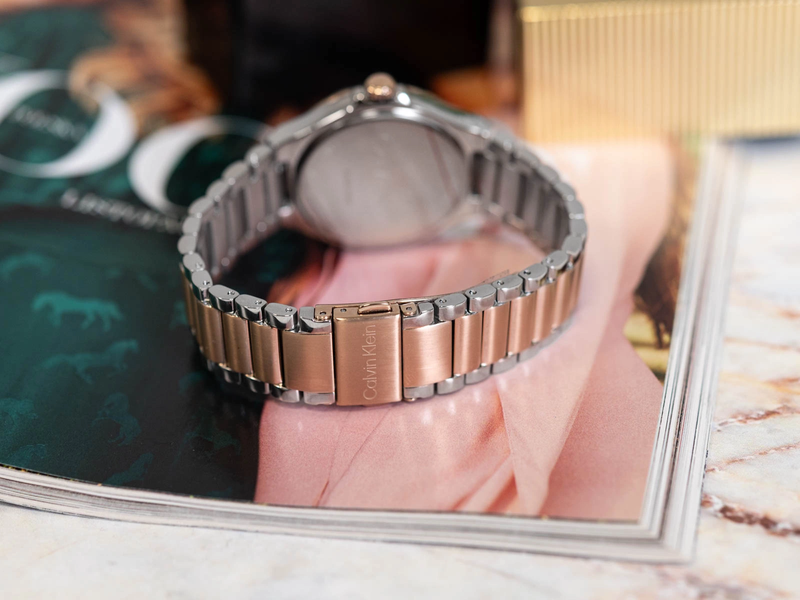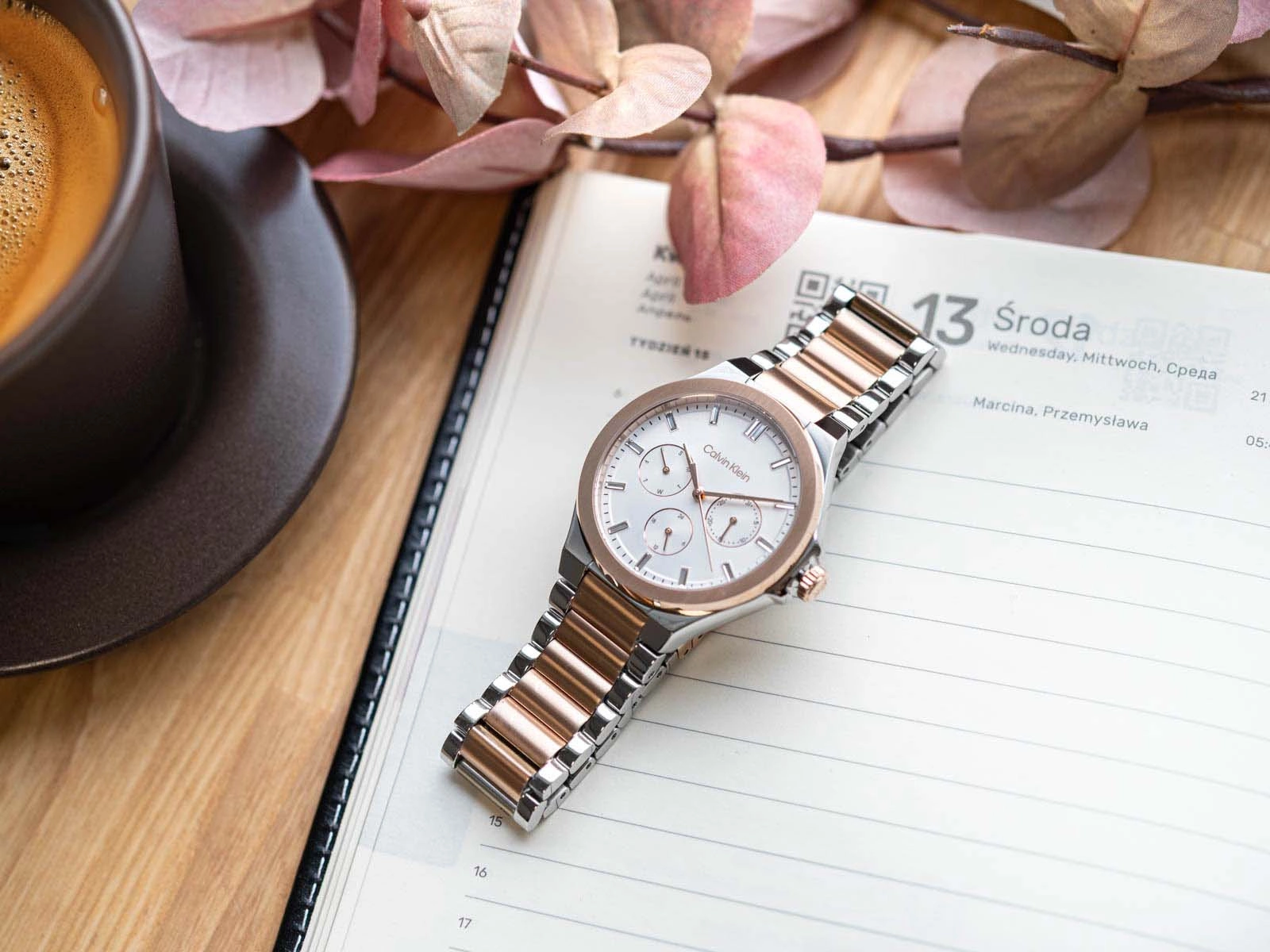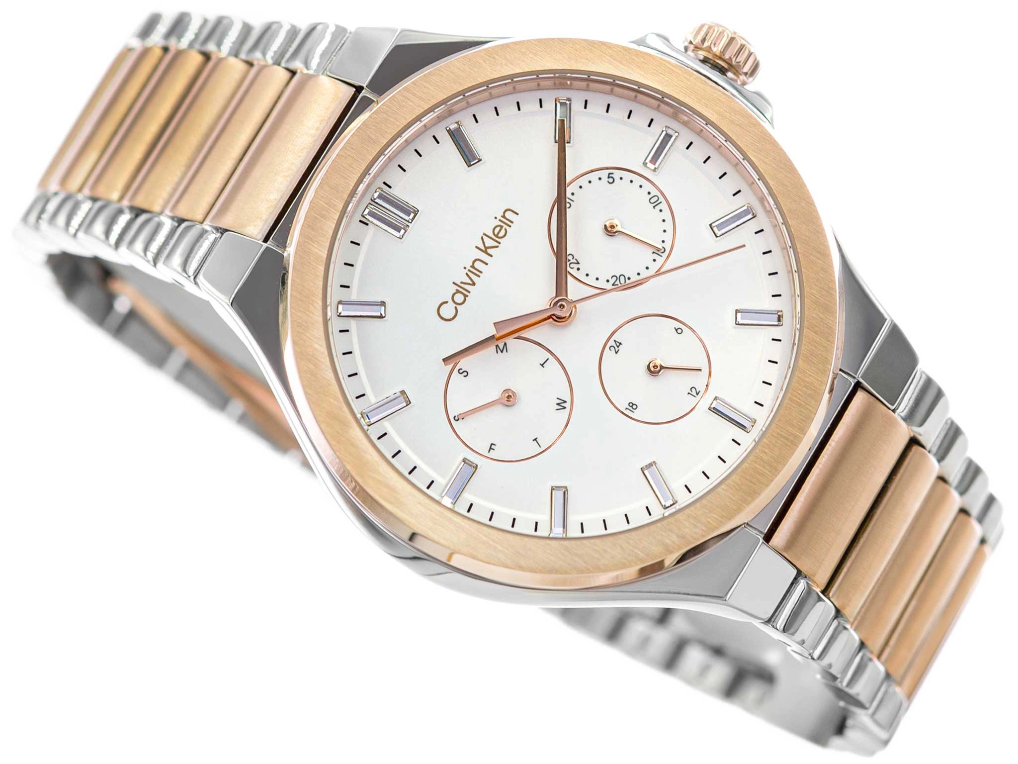 Calvin Klein 25100052 Vibrancy to elegancki zegarek damski, za którym stoi renomowana marka modowa. Model ten wyróżnia się unikalnym, dwukolorowym stylem, który łączy ponadczasową elegancję z modnymi akcentami. Zegarek został wykonany z wysokogatunkowej stali szlachetnej, co zapewnia trwałość i odporność na codzienne użytkowanie. Dwukolorowa koperta łączy srebro i różowe złoto, tworząc harmonijną i stylową kompozycję. Na nadgarstku prezentuje się niezwykle efektownie dzięki dopasowanej bransolecie, utrzymanej w tej samej kolorystyce. Zakończona jest wygodnym zapięciem motylkowym, które zapewnia komfort i bezpieczeństwo noszenia.