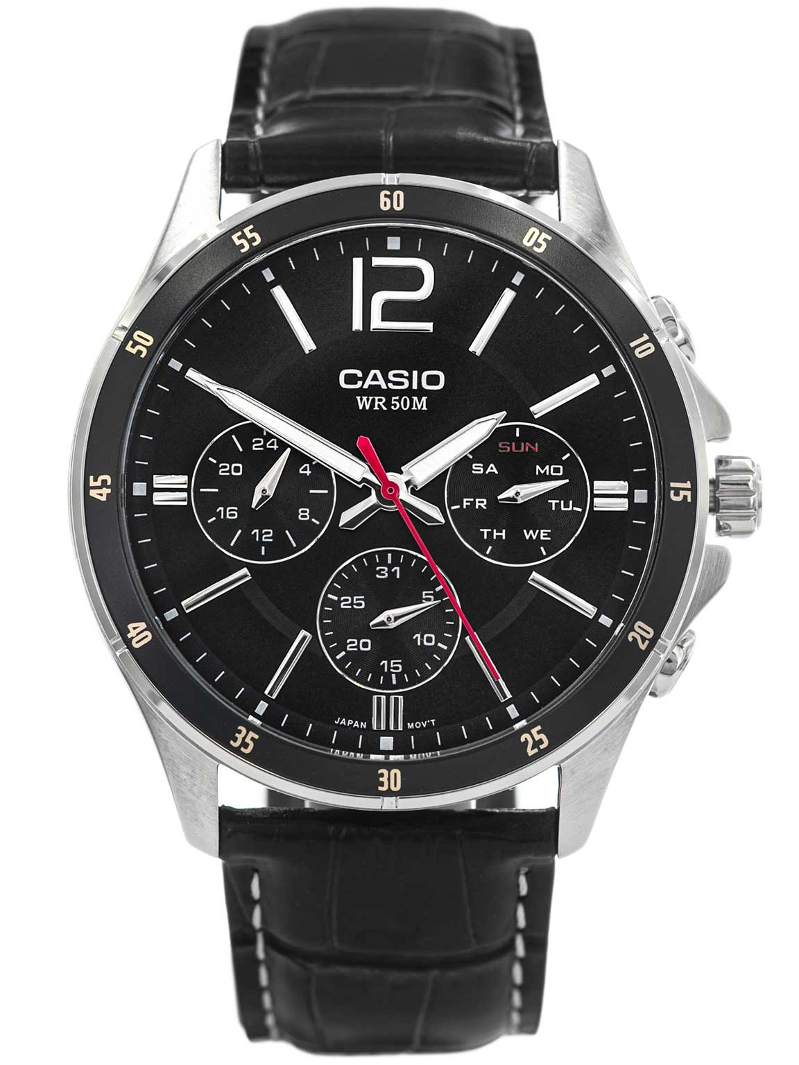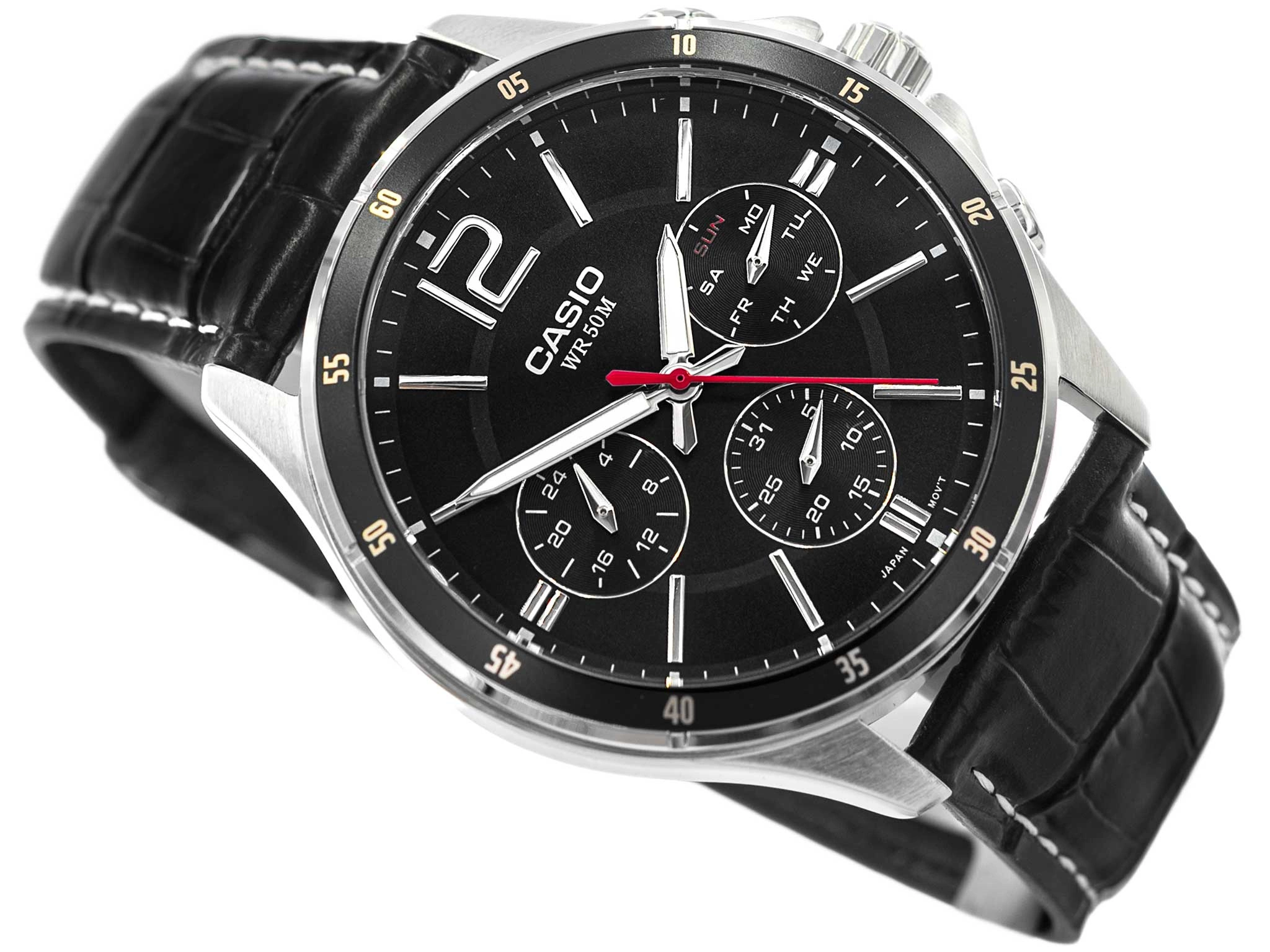 - Wodoszczelny Zegarek Męski Casio MTP-1374PL-1AVEF czarny na pasku, posiada funkcję datownika, neobrite.