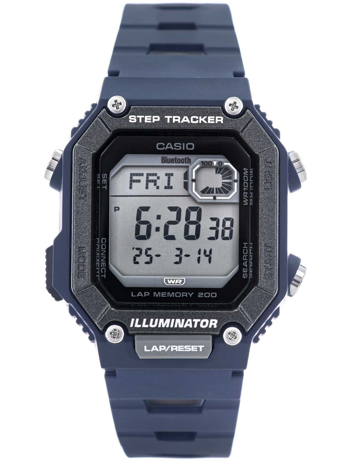 • Wodoszczelny Zegarek Męski Casio WS-B1000-2AVEF granatowy na pasku, posiada funkcje takie jak stoper, datownik, krokomierz i bluetooth.
