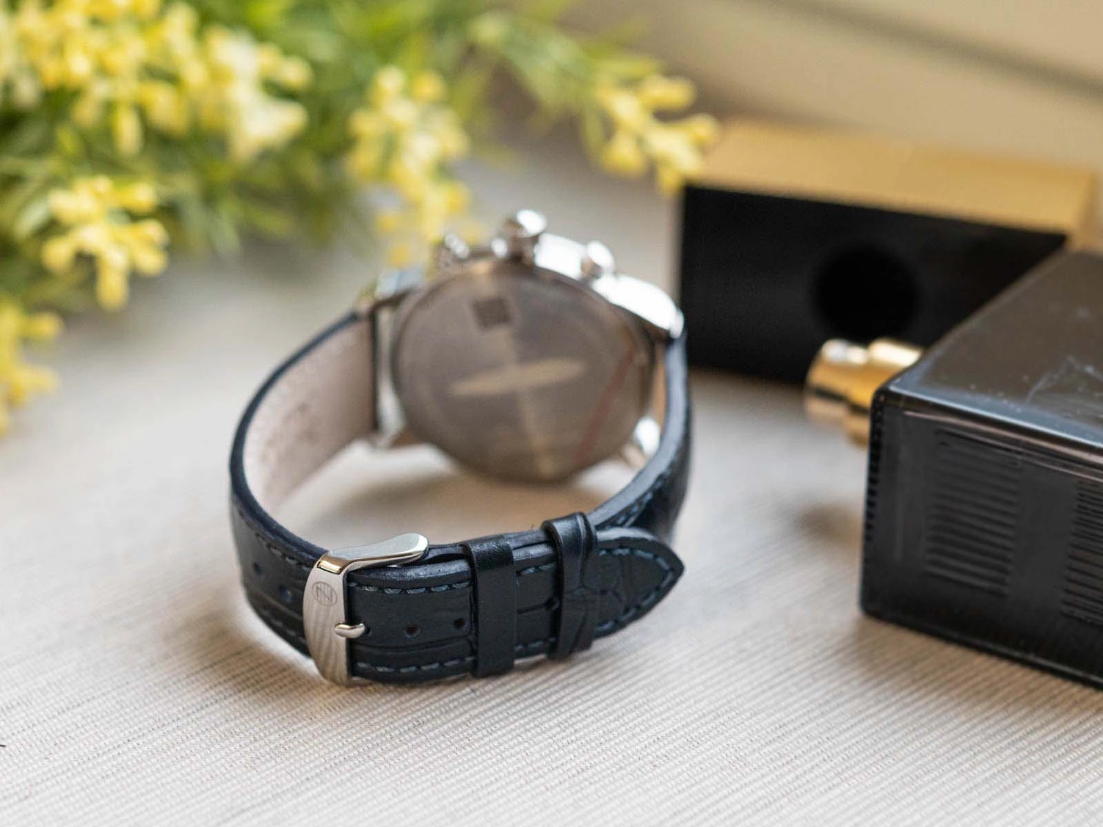 ZEPPELIN LZ14 Marine Chronograph 8888-3 to zegarek, który zachwyca zarówno eleganckim designem, jak i wysoką jakością wykonania. Jego mechanizm kwarcowy, zasilany wymienną baterią, gwarantuje precyzyjne odmierzanie czasu, a solidna konstrukcja zapewnia niezawodność przez długi czas. Koperta, stworzona z wysokiej jakości stali szlachetnej, jest odporna na korozję i zarysowania, a granatowy pasek wykonany z naturalnej skóry doskonale komponuje się z resztą zegarka, zapewniając wygodę noszenia i klasyczny wygląd. Pasek jest zapinany na tradycyjną sprzączkę, co pozwala na łatwe dopasowanie do nadgarstka. Tarcza zegarka w głębokim granatowym odcieniu stanowi eleganckie tło dla srebrnych liniowych indeksów oraz wskazówek, które są doskonale widoczne, dzięki wyraźnemu kontrastowi. Aby zapewnić pełną funkcjonalność w trudnych warunkach oświetleniowych, wskazówki oraz znaczniki nad indeksami zostały pokryte fosforyzującą powłoką neobrite, która po naświetleniu świeci w ciemności, umożliwiając wygodny odczyt godziny nawet w nocy. Zegarek wyposażony jest w trzy subtarcze, które są również w granatowym kolorze, tworząc spójną całość z cyferblatem. Odpowiadają one za pracę sekundnika zegarka oraz analogowego stopera, dzięki czemu ZEPPELIN LZ14 Marine Chronograph 8888-3 zyskuje dodatkową funkcjonalność. Wbudowany datownik, umieszczony na wysokości godziny czwartej, precyzyjnie wskazuje aktualny dzień miesiąca. Dodatkowo na obrzeżach cyferblatu znajdują się skale tachymetru i telemetru, które oferują ciekawe i praktyczne możliwości pomiarowe. Tachymetr pozwala na obliczenie średniej prędkości na określonym dystansie, co jest przydatne w wielu dziedzinach, takich jak motoryzacja czy sport. Telemetr z kolei umożliwia określenie odległości na podstawie różnicy czasu między zauważeniem zjawiska, a momentem usłyszenia jego dźwięku, co może być użyteczne w sytuacjach takich jak mierzenie odległości podczas burzy. Te funkcje sprawiają, że zegarek staje się nie tylko estetycznym dodatkiem, ale również praktycznym narzędziem. ZEGAREK ZEPPELIN LZ14 Marine Chronograph 8888-3 jest wyposażony w szkło mineralne, które skutecznie chroni cyferblat przed zarysowaniami i uszkodzeniami, zapewniając długotrwałą trwałość i estetyczny wygląd. Całość zegarka stanowi idealne połączenie klasycznego wzornictwa z nowoczesną funkcjonalnością. Dzięki staranności wykonania oraz użyciu wysokiej jakości materiałów, zegarek zyskał status ponadczasowego modelu, który pasuje do wielu okazji, zarówno formalnych, jak i codziennych. Eleganckie pudełko, w które zapakowany jest czasomierz, czyni go również doskonałym pomysłem na prezent.