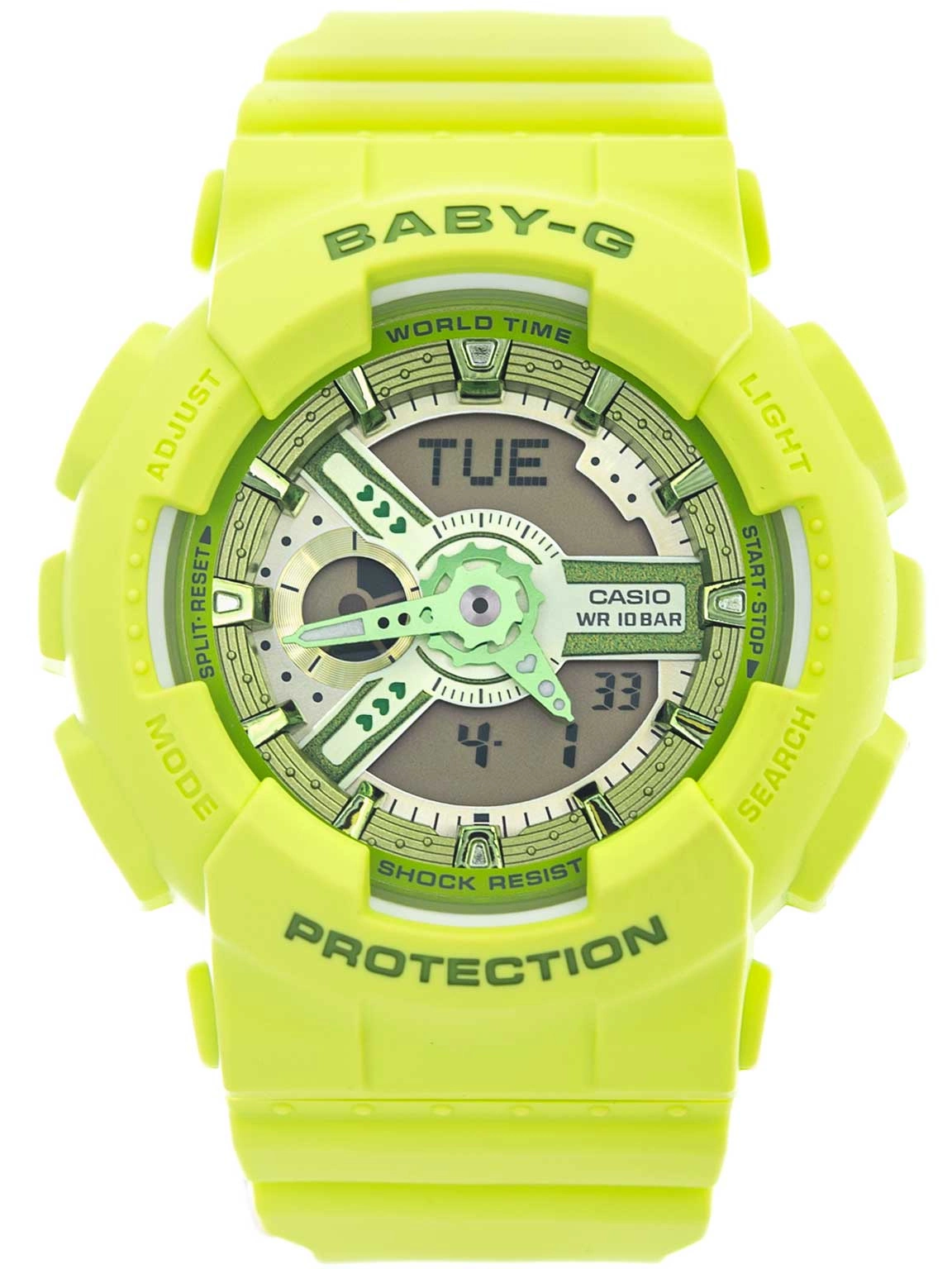 - Wodoszczelny Zegarek Damski Casio Baby-G BA-110YK 3A zielony na pasku, posiada funkcje takie jak stoper i datownik.