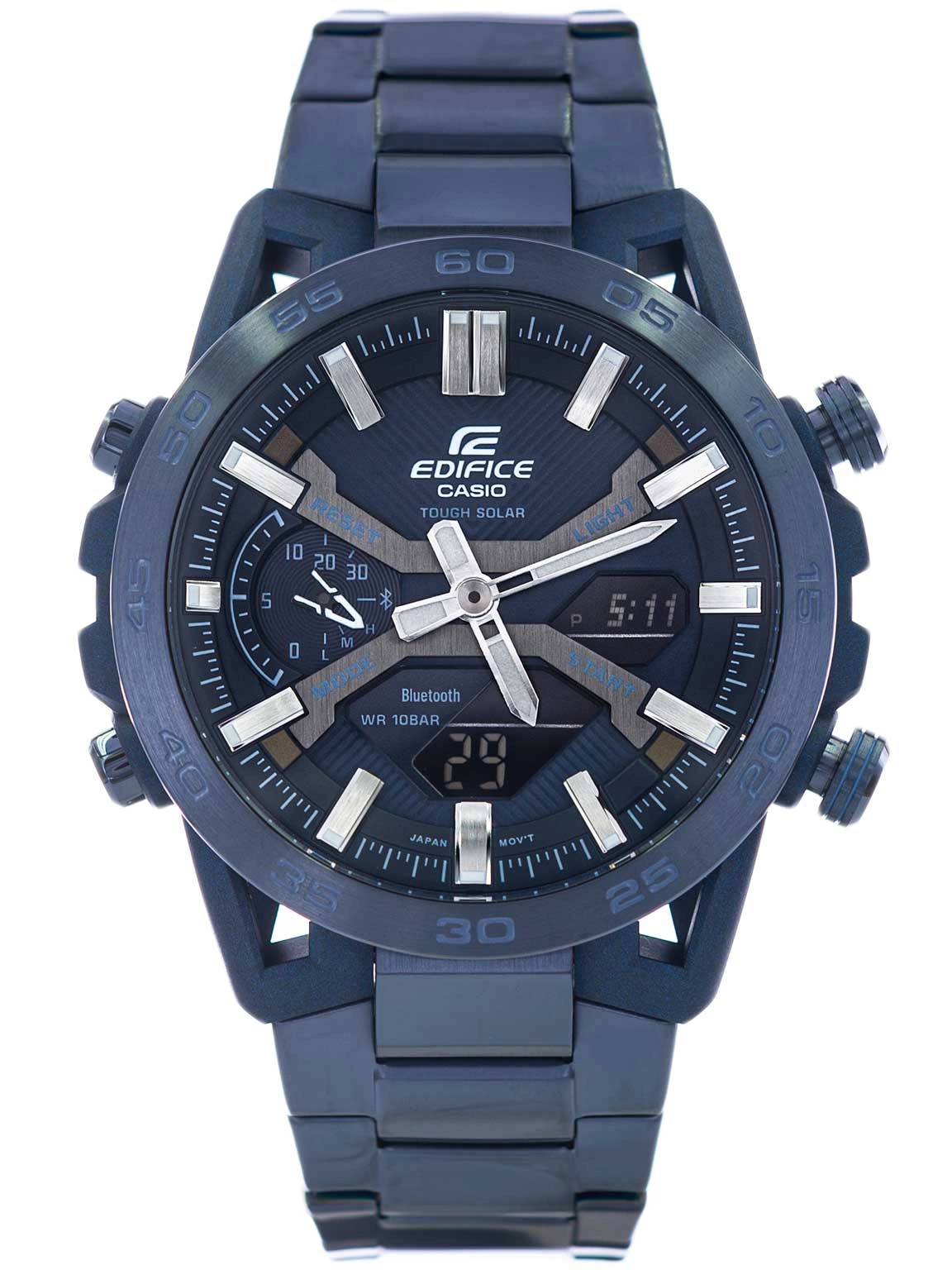 Casio Edifice ECB-2000CB-2AEF to zegarek, który łączy w sobie sportowy charakter z nowoczesnym designem i innowacyjną technologią. Już na pierwszy rzut oka przyciąga uwagę granatową kolorystyką, podkreślającą jego elegancki, a zarazem dynamiczny styl. Koperta wykonana z wysokiej jakości włókna węglowego zapewnia lekkość oraz wyjątkową trwałość, dzięki czemu zegarek jest odporny na uszkodzenia mechaniczne, a jednocześnie komfortowy w noszeniu. Bezel i bransoleta ze stali szlachetnej w tym samym odcieniu harmonizują z całością, tworząc spójny i nowoczesny wygląd, który doskonale sprawdzi się zarówno w codziennym użytkowaniu, jak i podczas bardziej formalnych okazji. Precyzyjnie zaprojektowana tarcza zegarka łączy analogowy system wskazań z cyfrowym wyświetlaczem, co pozwala na intuicyjną obsługę i szybki dostęp do zaawansowanych funkcji. Indeksy oraz wskazówki zostały pokryte warstwą neobrite, zapewniając doskonałą czytelność nawet w słabym oświetleniu. Dodatkową ochronę zapewnia płaskie szkiełko mineralne, które jest odporne na zarysowania i dodaje cyferblatowi głębi oraz przejrzystości. Wygodne rozmieszczenie elementów na tarczy sprawia, że mimo bogatej funkcjonalności zegarek pozostaje przejrzysty i łatwy w użytkowaniu.