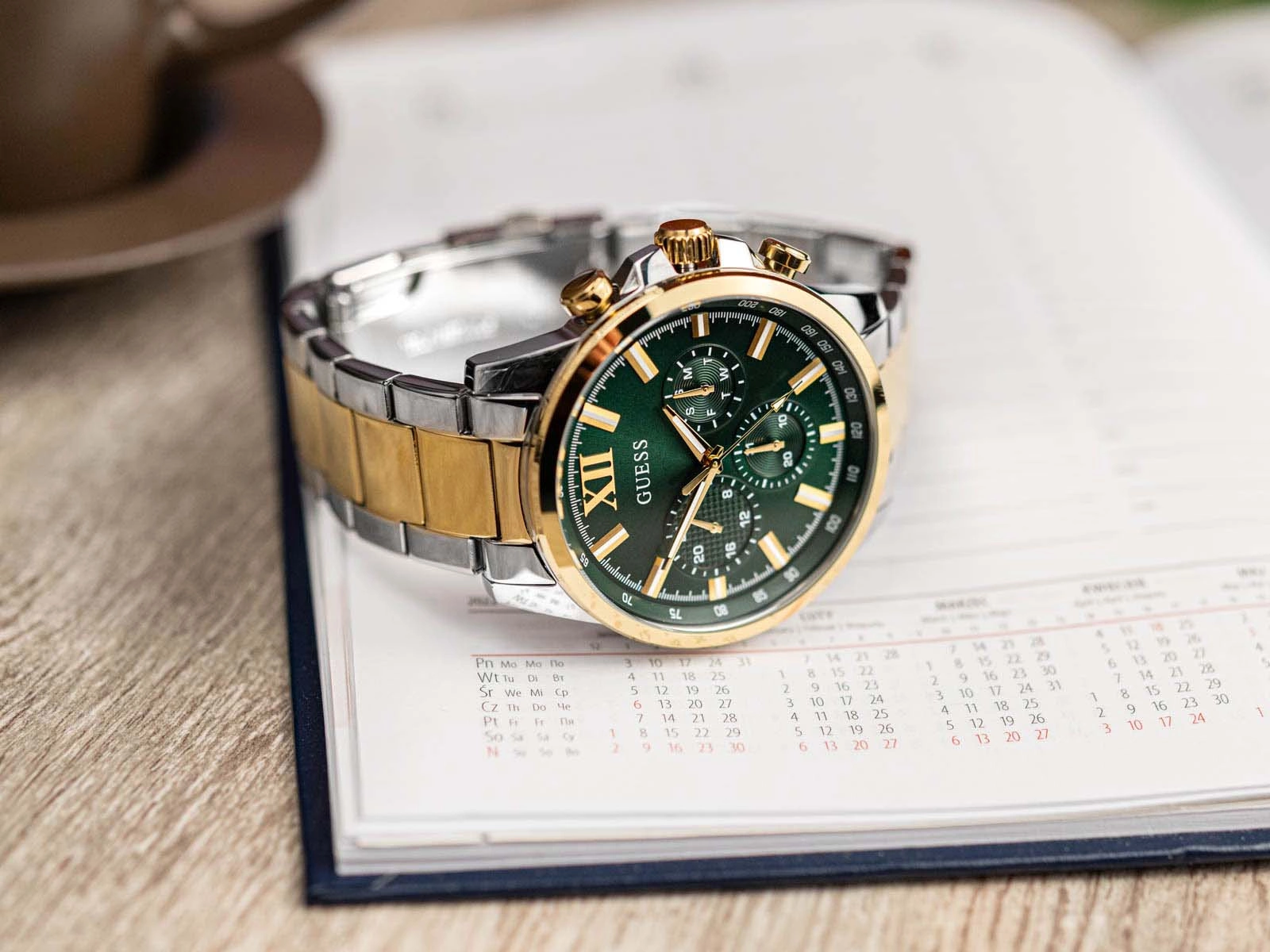 Guess Walker GW0900G5 to wyjątkowy zegarek męski, który łączy w sobie nowoczesną elegancję z odrobiną klasyki. Jego srebrna koperta ozdobiona złotym bezelem, wykonana z wysokiej jakości stali szlachetnej, wyróżnia się subtelnym połyskiem i solidnością, która zapewnia trwałość przez wiele lat. Koperta w połączeniu z równie elegancką bransoletą, również utrzymana w modnej srebrno-złotej kompozycji kolorystycznej tworzy harmonijną całość, dodając zegarkowi wyjątkowego charakteru. Zastosowane zapięcie motylkowe zapewnia wygodę użytkowania, a jednocześnie pozwala na bezpieczne noszenie zegarka przez cały dzień. Na tarczy umieszczono złote wskazówki i indeksy, które pięknie kontrastują z zielonym tłem, zapewniając doskonałą czytelność. Godzina dwunasta została oznaczona klasyczną cyfrą rzymską, a pozostałe godziny wyznaczają eleganckie indeksy liniowe. Złote detale nie tylko podkreślają prestiż zegarka, ale również dodają mu subtelnej, ponadczasowej elegancji. Aby zapewnić czytelność nawet w słabszych warunkach oświetleniowych, zarówno wskazówki, jak i indeksy zostały pokryte powłoką luminescencyjną neobrite, która po wcześniejszym naświetleniu świeci delikatnym blaskiem. Dzięki temu zegarek staje się funkcjonalny i praktyczny o każdej porze dnia i nocy.
