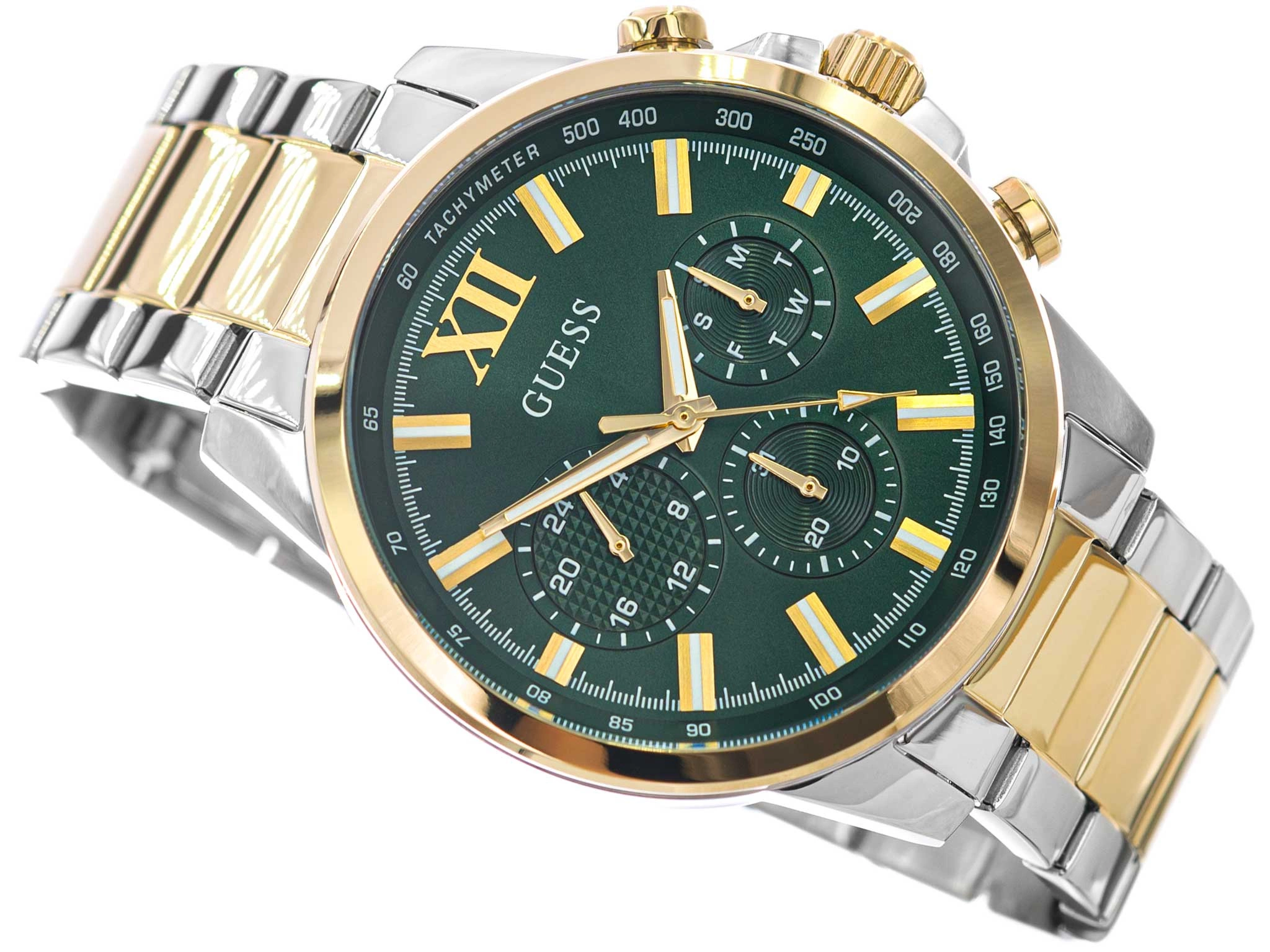 Dodatkowe subtarcze, wyróżniające się inną fakturą, pełnią funkcję datownika, umożliwiając wskazanie dnia tygodnia, dnia miesiąca oraz godziny w formacie 24-godzinnym. Całość otacza podziałka tachymetru, która dodaje modelowi sportowego charakteru, sprawiając, że GW0900G5 to nie tylko elegancka, ale także funkcjonalna propozycja. Zabezpieczony odpornego na zarysowania szkłem mineralnym, zegarek zachowuje swój estetyczny wygląd i trwałość przez długi czas. Guess GW0900G5 to zegarek, który z powodzeniem dopasuje się do wielu stylizacji, zarówno formalnych, jak i bardziej casualowych. Jego niezwykła kombinacja kolorystyczna – z zieloną tarczą, złotymi wskazówkami i srebrno-złotą kopertą – sprawia, że jest to model, który przyciąga wzrok i podkreśla indywidualny styl właściciela. Zegarek zapakowany w eleganckie pudełko stanowi doskonały wybór na prezent dla osoby, która ceni elegancję i najwyższą jakość.