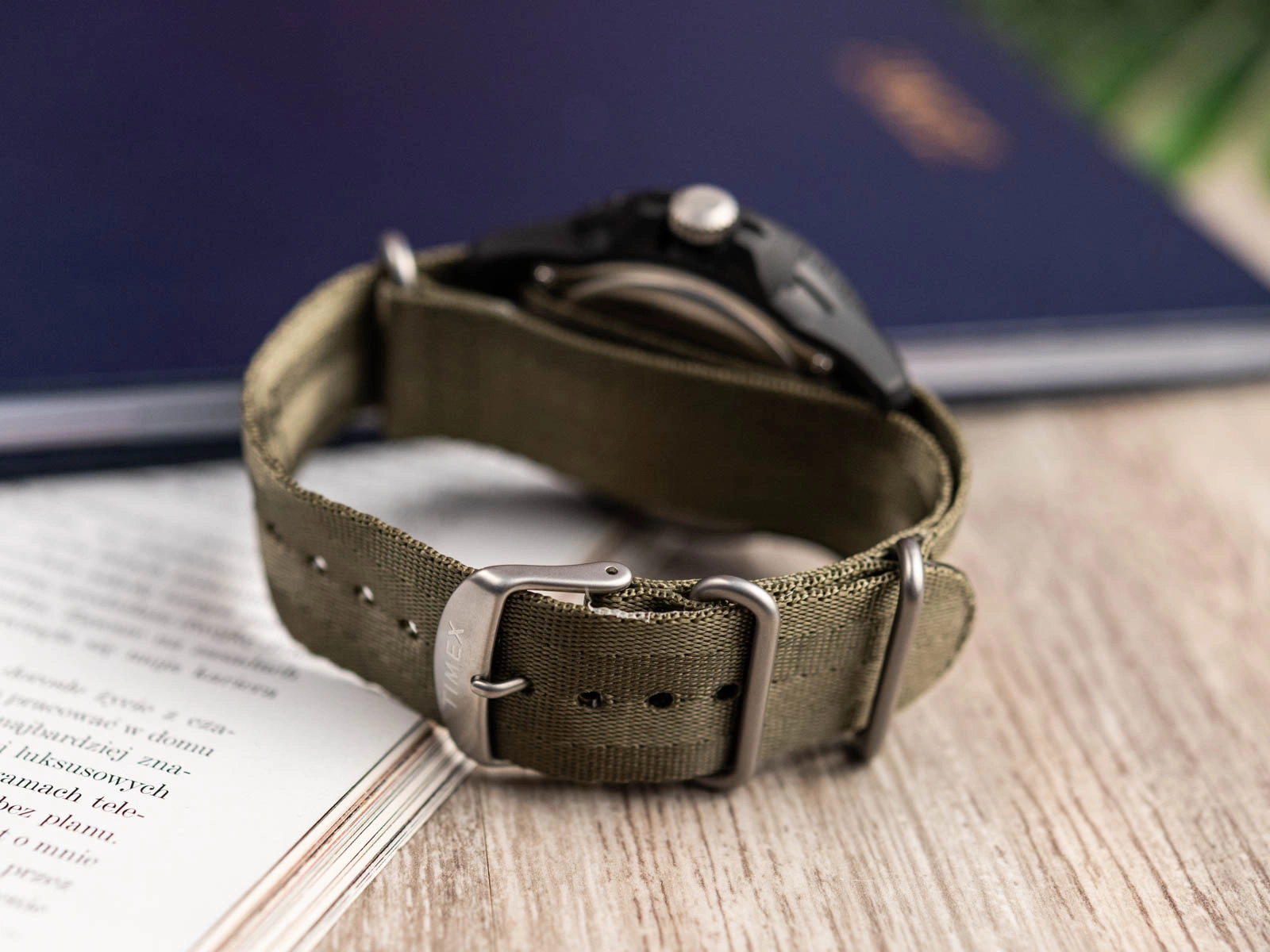 Timex TW4B14500 Expedition to kolejny model z cenionej serii Expedition, który łączy harmonijny styl z nowoczesnymi rozwiązaniami. Matowa, czarna koperta doskonale komponuje się z wytrzymałym, materiałowym paskiem typu NATO. Ciemny cyferblat wzbogacono o czerwone akcenty, nadające zegarkowi świeżego, dynamicznego charakteru. Przy godzinie 3 umieszczono praktyczny datownik, wskazujący aktualny dzień miesiąca.