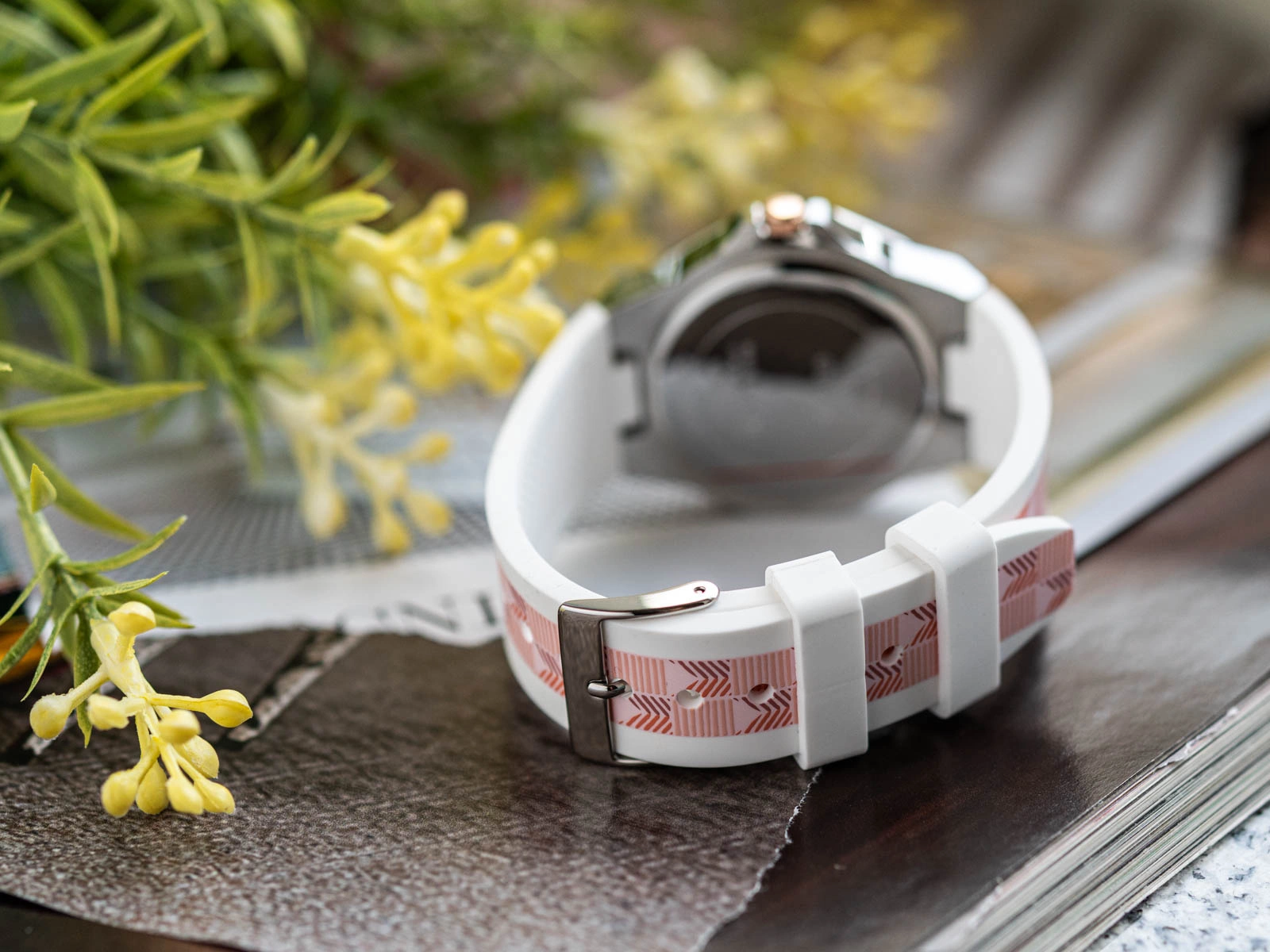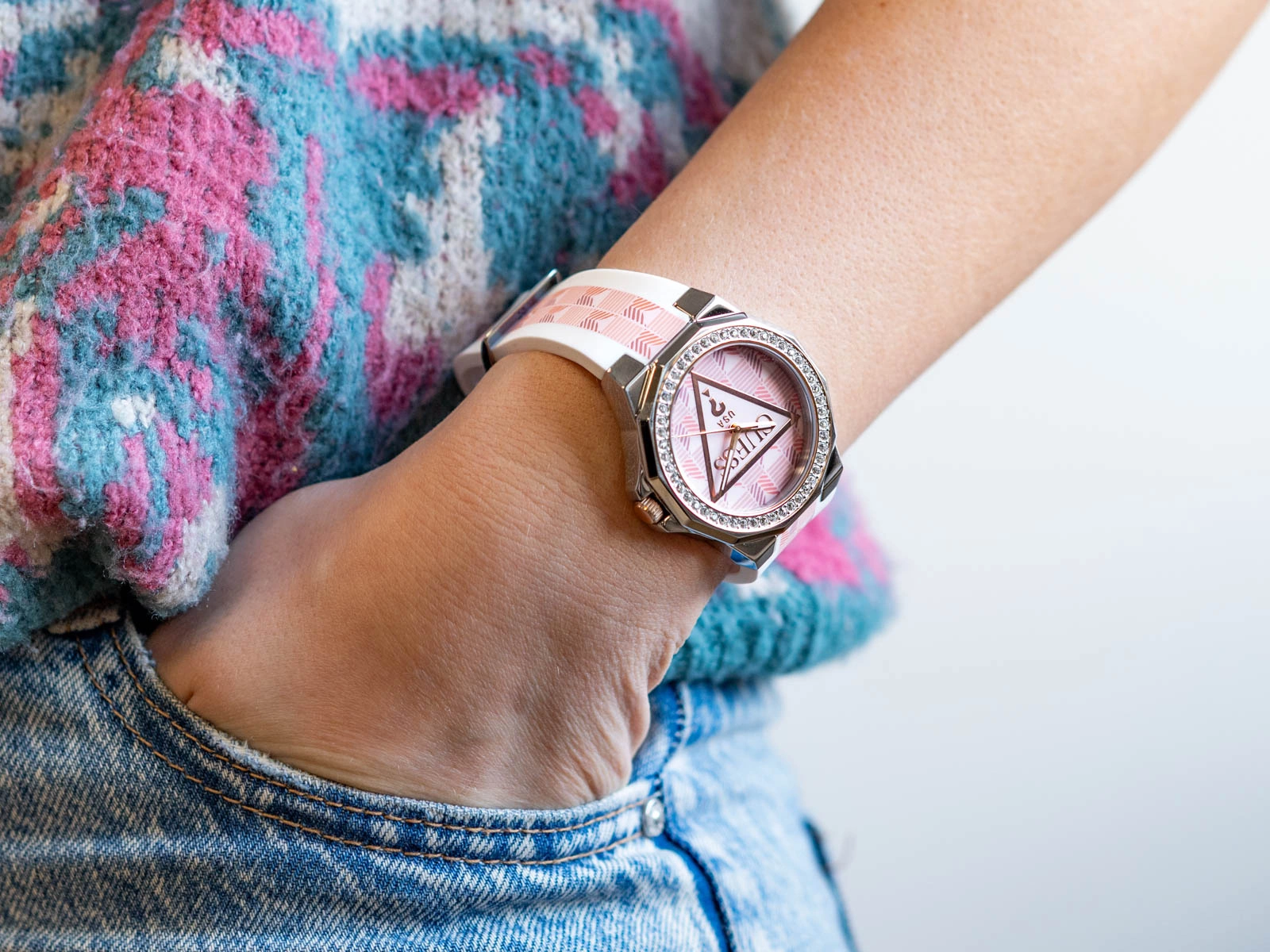 Guess GW0834L2 Resort to propozycja dla kobiet, które cenią sobie nowoczesny design z nutą sportowego charakteru. Model wyróżnia się świeżą, biało-różową kolorystyką, która nadaje mu lekkości i energii. Srebrna koperta ze stali nierdzewnej idealnie komponuje się z wygodnym, wzorzystym paskiem wykonanym z trwałego tworzywa sztucznego, gwarantując komfort noszenia na co dzień. Na unikalnej tarczy zegarka znajduje się charakterystyczne logo marki w formie odwróconego trójkąta, które podkreśla jego oryginalny styl. Sercem czasomierza jest precyzyjny japoński mechanizm kwarcowy, ceniony za niezawodność i dokładność działania.