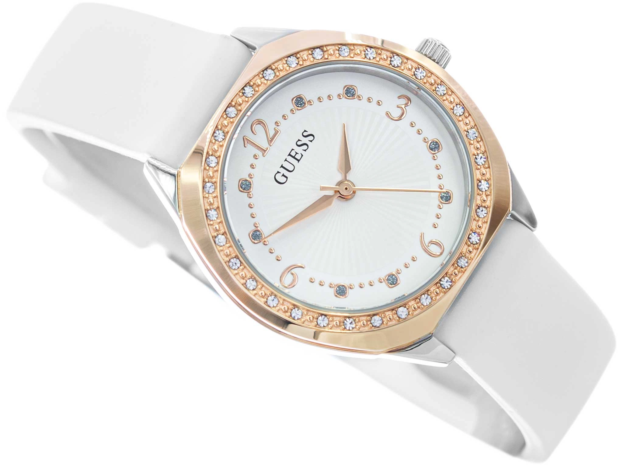 Zegarek GUESS Charlotte GW0820L3 to kwintesencja elegancji i współczesnego stylu, stworzona z myślą o kobietach, które cenią sobie wyrafinowany wygląd oraz najwyższą jakość wykonania. Ten wyjątkowy model doskonale łączy w sobie ponadczasową klasykę z nutą nowoczesności, stanowiąc idealne uzupełnienie zarówno codziennych, jak i bardziej formalnych stylizacji. Koperta zegarka, wykonana z trwałej stali szlachetnej w odcieniu subtelnego różowego złota, prezentuje się niezwykle efektownie. Jej ozdobą jest delikatny rząd połyskujących cyrkonii, które dodają całości biżuteryjnego charakteru i eleganckiego blasku. To właśnie ten detal sprawia, że model Charlotte przyciąga spojrzenia i staje się wyjątkowym elementem każdej stylizacji. Biały pasek wykonany z wysokiej jakości tworzywa sztucznego nie tylko doskonale kontrastuje z barwą koperty, ale także zapewnia wysoki komfort noszenia. Jest miękki, elastyczny i idealnie dopasowuje się do nadgarstka, co czyni go praktycznym wyborem na każdy dzień.