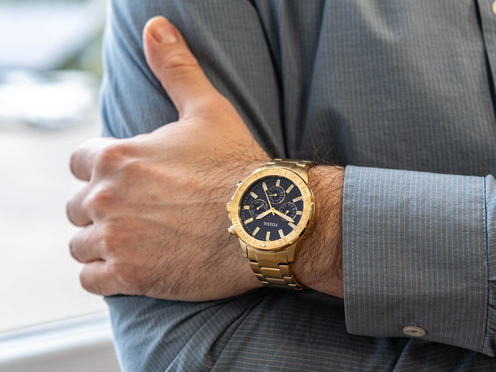 Fossil BQ2706 Bannon to elegancki i zdecydowany wybór dla mężczyzn, którzy lubią wyróżniać się wyrazistymi dodatkami. Model ten przyciąga uwagę dzięki dużej kopercie zestawionej z solidną, szeroką bransoletą – obie części wykonano z wysokiej jakości stali szlachetnej w stylowym odcieniu postarzanego złota. Granatowa tarcza zdobiona jest dużymi, pionowymi indeksami w jasnym kolorze, co zapewnia szybki i wygodny odczyt godziny. Zarówno indeksy, jak i wskazówki pokryto warstwą neobrite, która świeci w ciemności po wcześniejszym naświetleniu, co sprawia, że zegarek jest funkcjonalny również przy słabym oświetleniu.