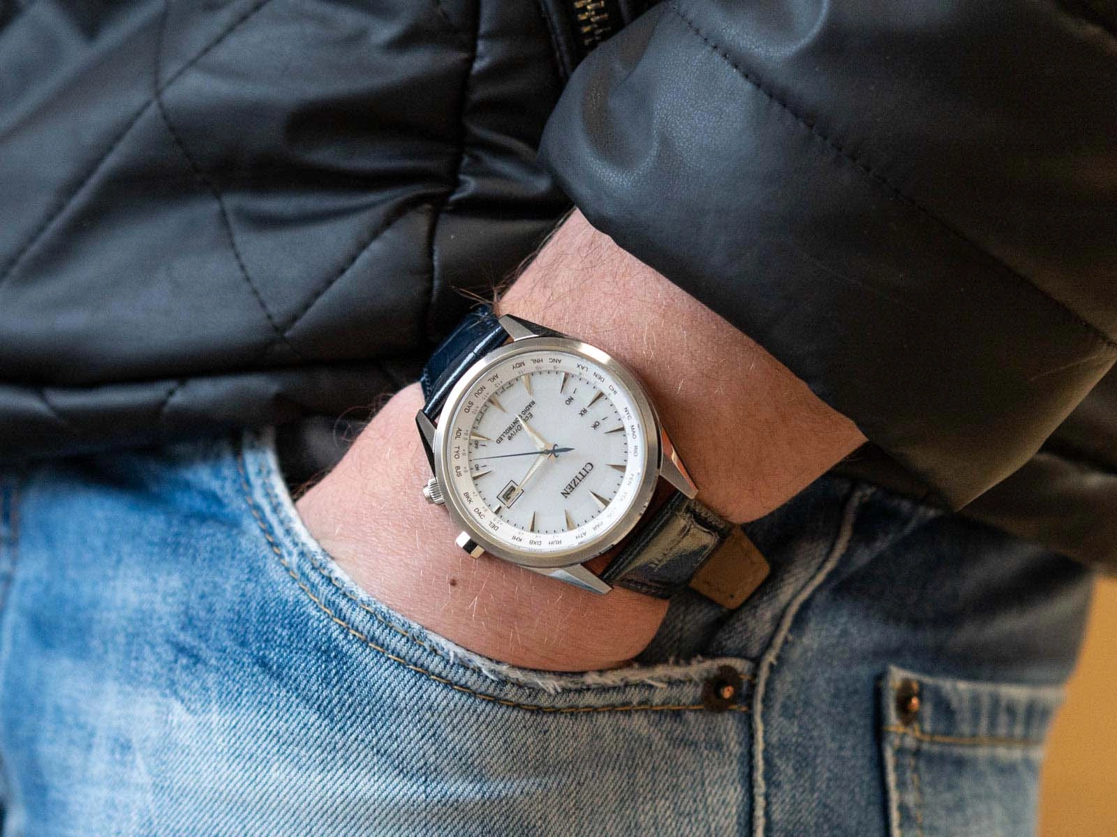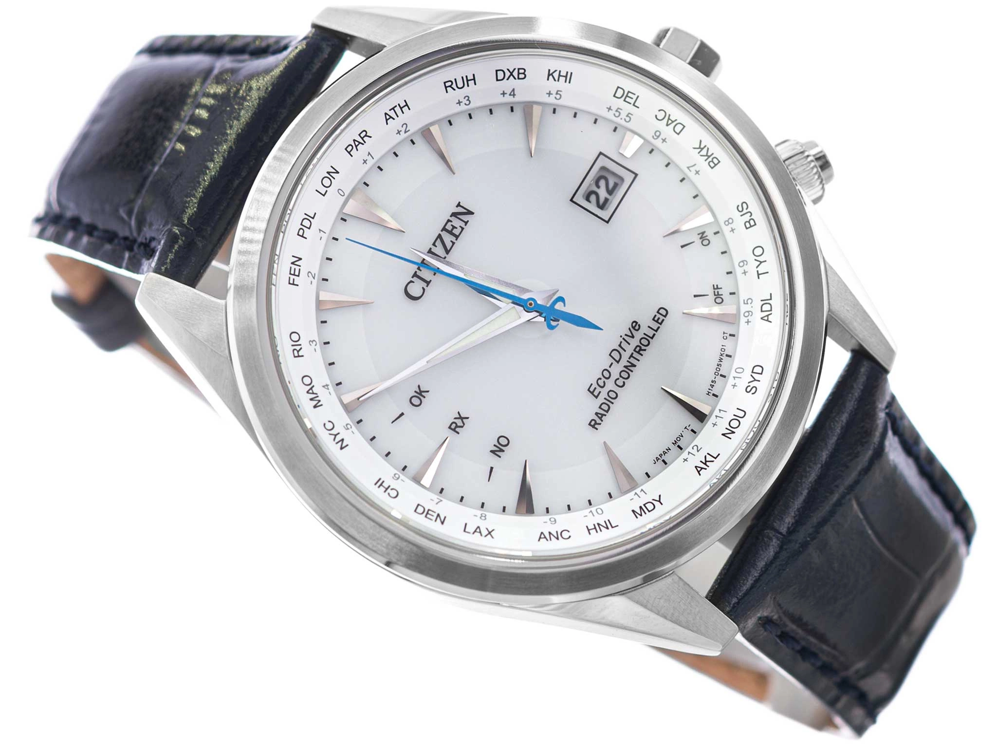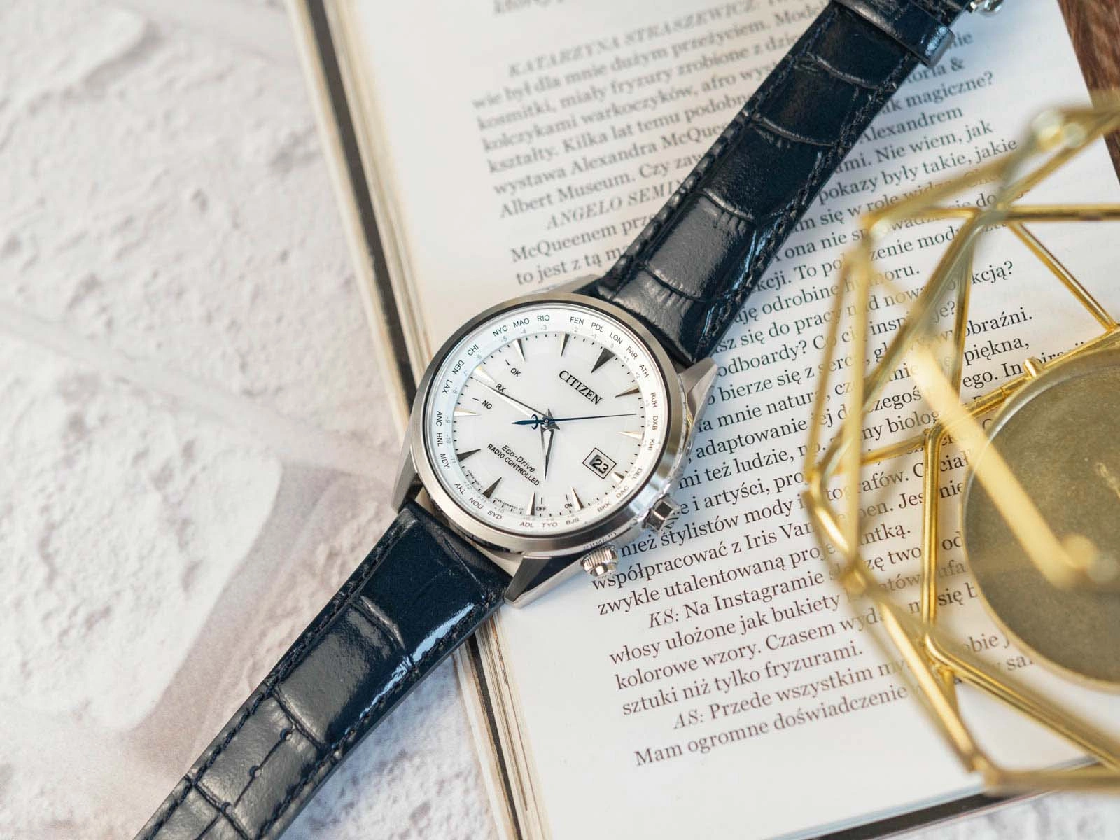 - Solarny Zegarek Męski Citizen CB0270-10A granatowy na pasku, posiada funkcje radio controlled, czas światowy i datownik. Zegarek wodoszczelny.