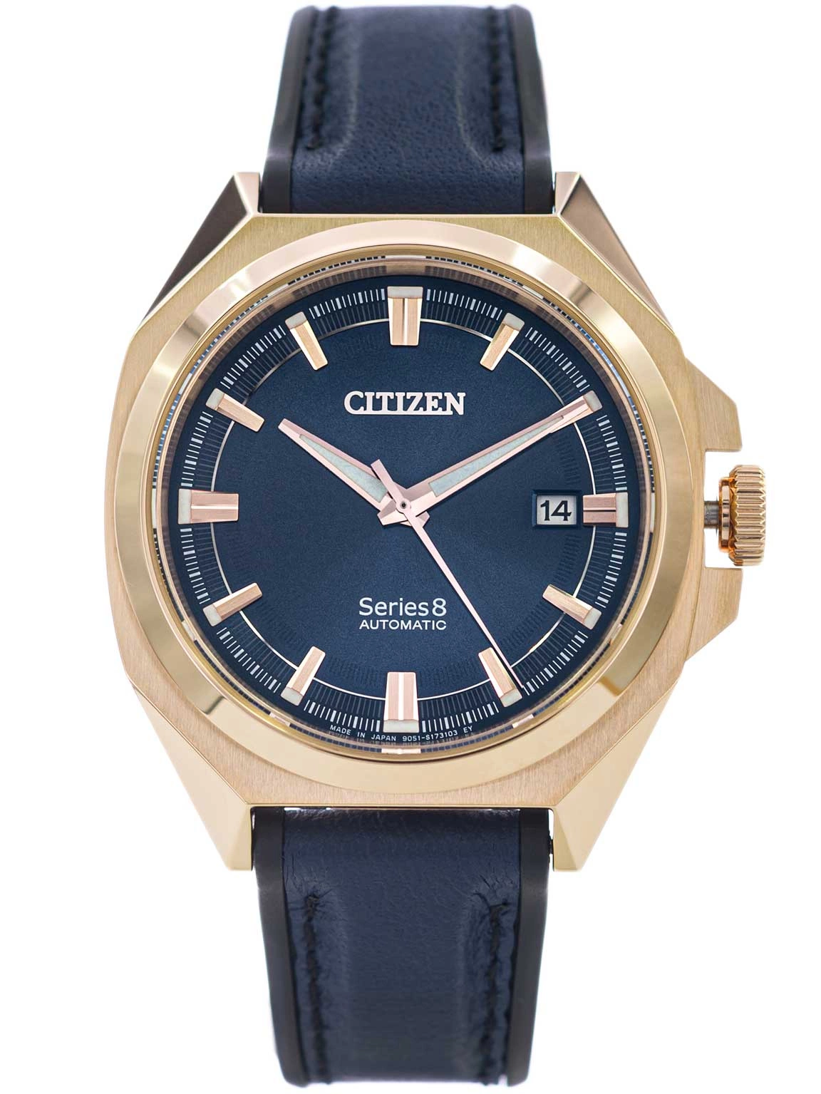 Citizen NB6012-18L Automatic Mechanical Series 8 to połączenie minimalistycznego stylu i wyjątkowej, japońskiej precyzji wykonania. Sercem tej doskonałej konstrukcji jest mechanizm automatyczny, który nakręca się samoczynnie podczas naturalnego ruchu ręki, zapewnia wygodę. Mechanizm działa dzięki energii kinetycznej generowanej przez ruch ręki użytkownika, a dla wygody można go również dokręcać ręcznie za pomocą koronki. Dodatkową zaletą kalibru 9051 jest jego wysoka odporność na działanie pól magnetycznych – dzięki zastosowaniu materiałów antymagnetycznych w konstrukcji balansu i jego otoczenia, zegarek może być użytkowany w pobliżu urządzeń elektronicznych, takich jak smartfony, bez ryzyka zakłócenia jego pracy. Utrzymana w modnej kolorystyce różowego złota wykonana z wysokiej jakości stali szlachetnej koperta została zawieszona na wygodnym, granatowym skórzanym pasku z czarnymi gumowymi wykończeniem. Pasek zapinany jest na klasyczna sprzączkę. Na tarczy znajdują się również utrzymane w kolorystyce różowego złota indeksy liniowe oraz wskazówki pokryte powłoką neobrite, które po wcześniejszym naświetleniu będą świeciły przez jakiś czas. Granatowy cyferblat, który stanowi doskonale kontrastujące tło dla wskazówek i indeksów zabezpiecza szkło szafirowe. Na wysokości godziny trzeciej umieszczono okienko datownika wskazującego dzień miesiąca. Citizen NB6012-18L Automatic Mechanical Series 8 sprawdza się zarówno w codziennym użyciu, jak i podczas ważniejszych wydarzeń, podkreślając styl i osobowość właściciela. Zapakowany w eleganckie pudełko świetnie sprawdzi się jako prezent dla mężczyzny.