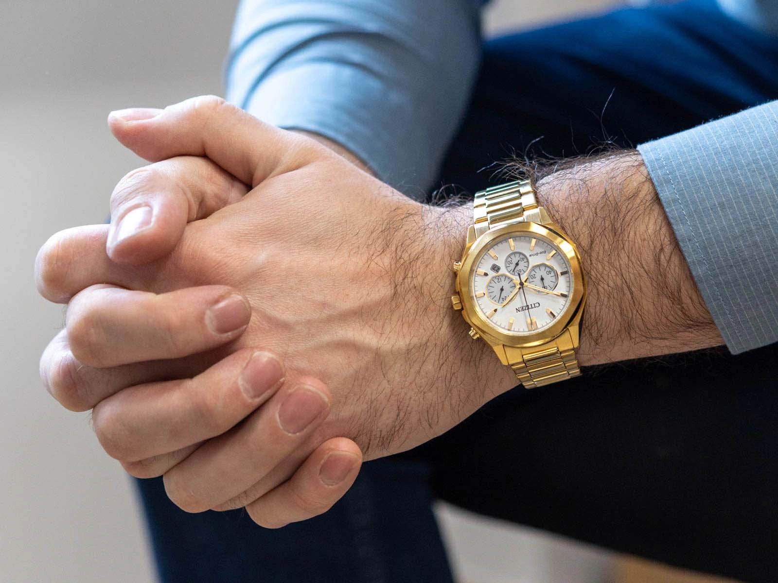 • Solarny Zegarek Męski Citizen CA4592-85A złoty na bransolecie, posiada funkcje takie jak stoper i datownik. Zegarek wodoszczelny.