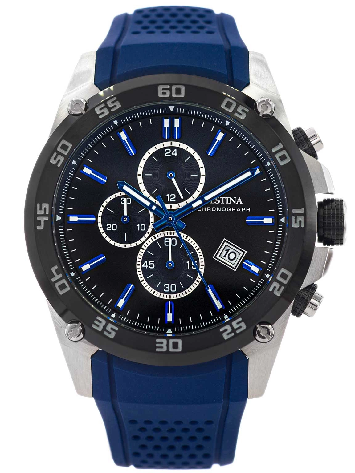 - Wodoszczelny Zegarek Męski Festina F20330/A granatowy na pasku. Posiada funkcje datownika, neobrite oraz stoper.