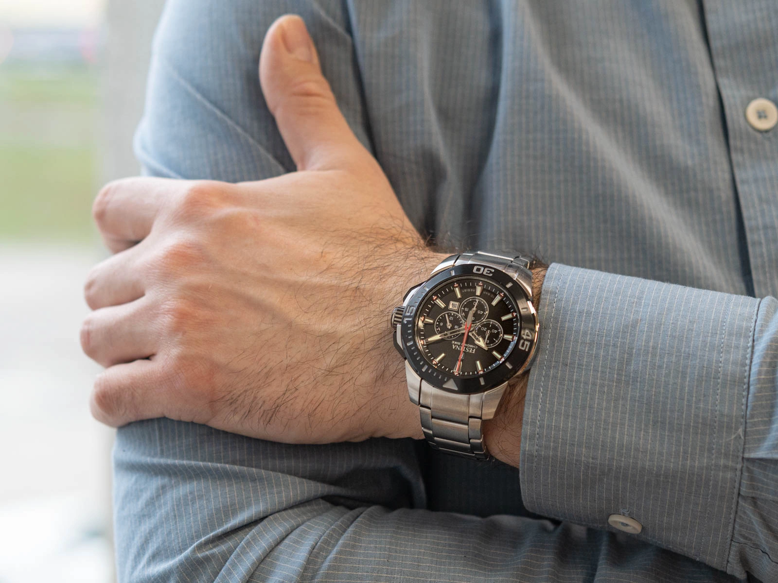 Centralnym elementem kompozycji jest głęboko czarna tarcza, która emanuje nowoczesną surowością i czytelnością. Gładka, jednolita powierzchnia została zestawiona z kontrastującymi indeksami godzinowymi oraz wskazówkami, które wykonano w srebrzysto-białej kolorystyce. Zarówno indeksy, jak i wskazówki pokryto warstwą luminescencyjną typu neobrite – specjalną fosforyzującą powłoką, która po uprzednim naświetleniu emituje światło w ciemności, znacząco poprawiając czytelność w warunkach ograniczonego oświetlenia. Dzięki temu zegarek pozostaje funkcjonalny także wieczorem, nocą lub podczas uprawiania sportów w trudnych warunkach pogodowych. Na tarczy umieszczono trzy czarne subtarcze, które harmonijnie wtapiają się w tło, zachowując jednak swoją funkcjonalność i estetyczne zróżnicowanie dzięki delikatnym pierścieniom okalającym każdą z nich. Lewa subtarcza pełni funkcję stopera i mierzy czas z dużą precyzją, dolna prezentuje ciągły sekundnik, natomiast prawa wskazuje czas w formacie 24-godzinnym, pozwalając na łatwe odczytanie pory dnia niezależnie od lokalizacji czy strefy czasowej. Pomiędzy godziną czwartą a piątą zlokalizowano niewielkie, ale czytelne okienko datownika, które informuje o aktualnym dniu miesiąca – to praktyczny dodatek, który zwiększa codzienną funkcjonalność zegarka bez zaburzania jego symetrii i przejrzystości.