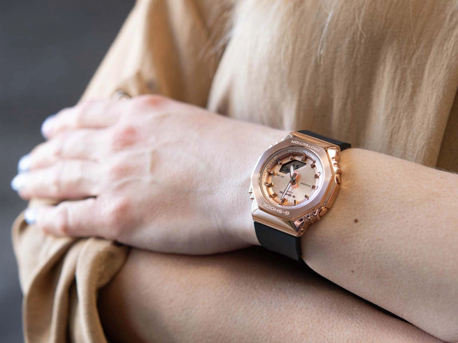 - Zegarek Damski Casio G-SHOCK GM-S2110PG 1A4ER beżowy na pasku, posiada funkcje takie jak stoper i datownik.