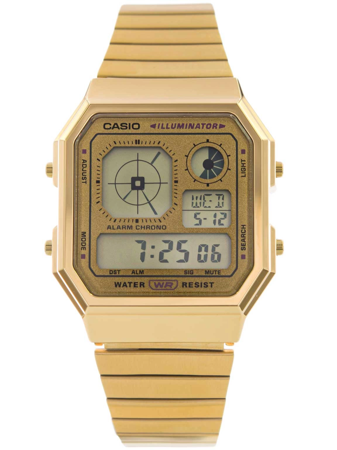- Zegarek Casio A130WEG-9A złoty na bransolecie, posiada funkcje takie jak stoper, alarm i podświetlenie.