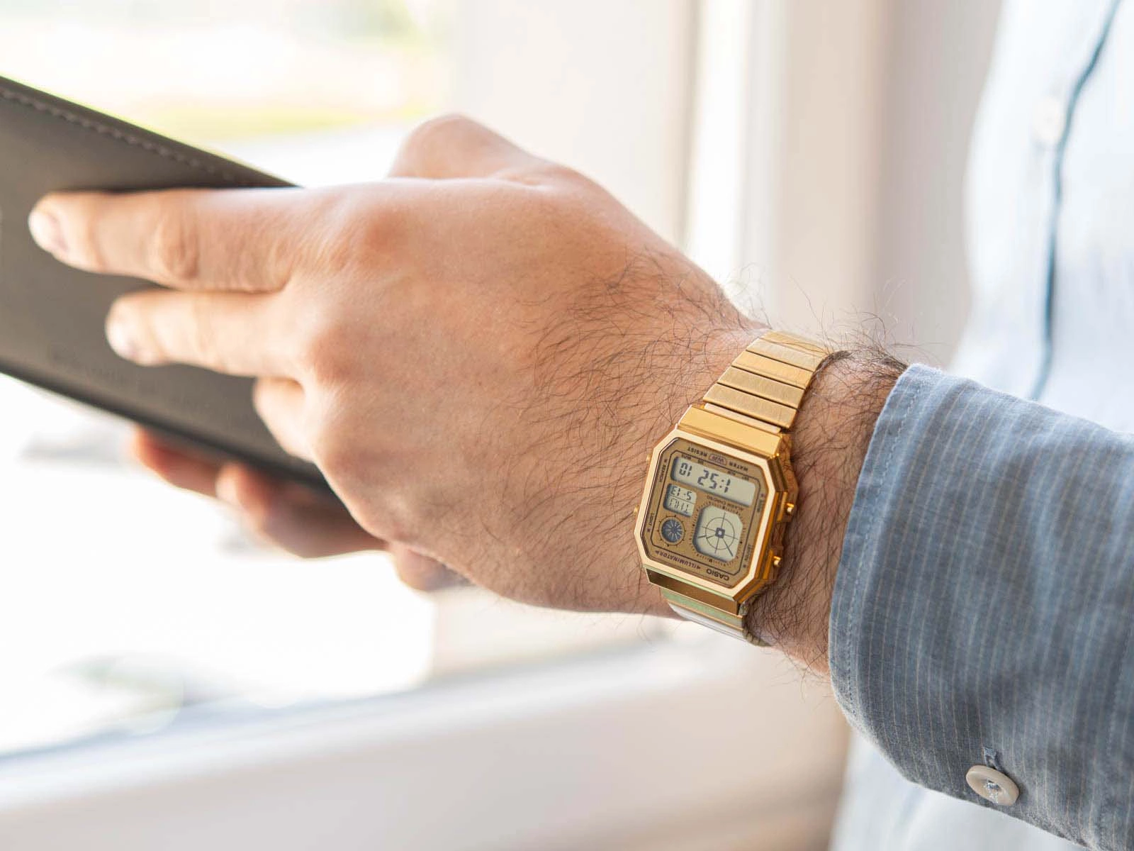 Casio A130WEG-9AEF to zegarek, który z powodzeniem łączy ducha minionych dekad z potrzebami współczesnych użytkowników. Stanowi on nowoczesne spojrzenie na kultowe modele Casio z lat 80. i 90., zachowując ich niepowtarzalny charakter, ale wzbogacając o nowe funkcjonalności i wygodę użytkowania. To idealna propozycja dla miłośników stylu vintage, którzy cenią praktyczność w codziennym życiu. Charakterystyczna, geometryczna koperta o kompaktowych wymiarach została zaprojektowana tak, by subtelnie przyciągać uwagę, a jednocześnie zapewniać maksymalną wygodę noszenia. We wnętrzu pracuje precyzyjny mechanizm kwarcowy zasilany baterią, znany z niezawodności. Zegarek wyposażono w stylową, złotą bransoletę ze stali nierdzewnej, którą można łatwo dopasować do nadgarstka bez użycia dodatkowych narzędzi – to wygoda i styl w jednym.