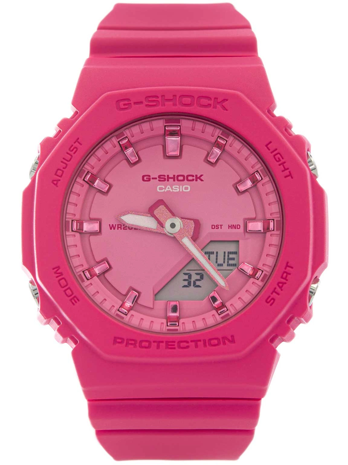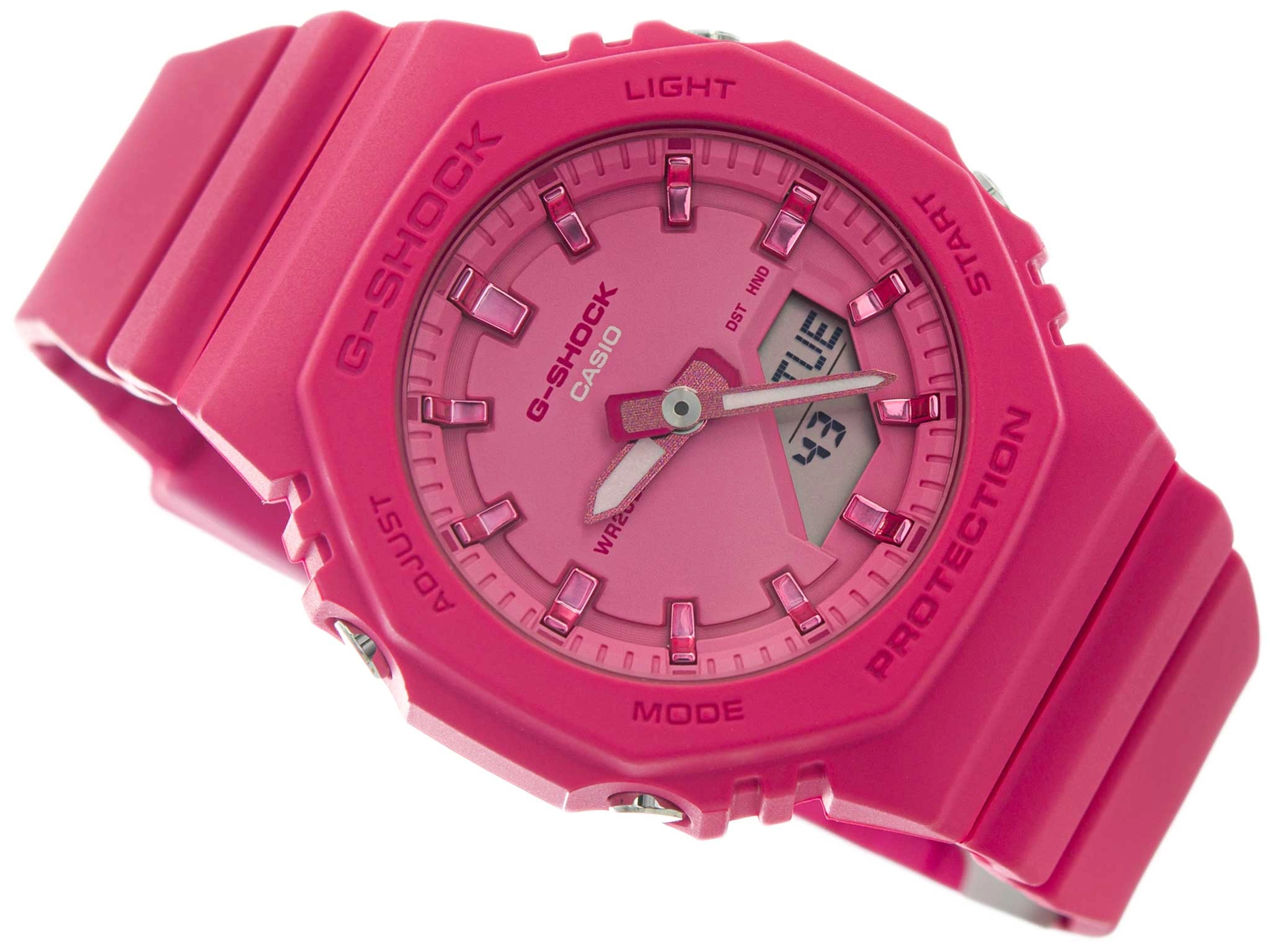 - Wodoszczelny Zegarek Damski Casio G-SHOCK GMA-P2100PP 4A różowy na pasku, posiada funkcje takie jak stoper i datownik.