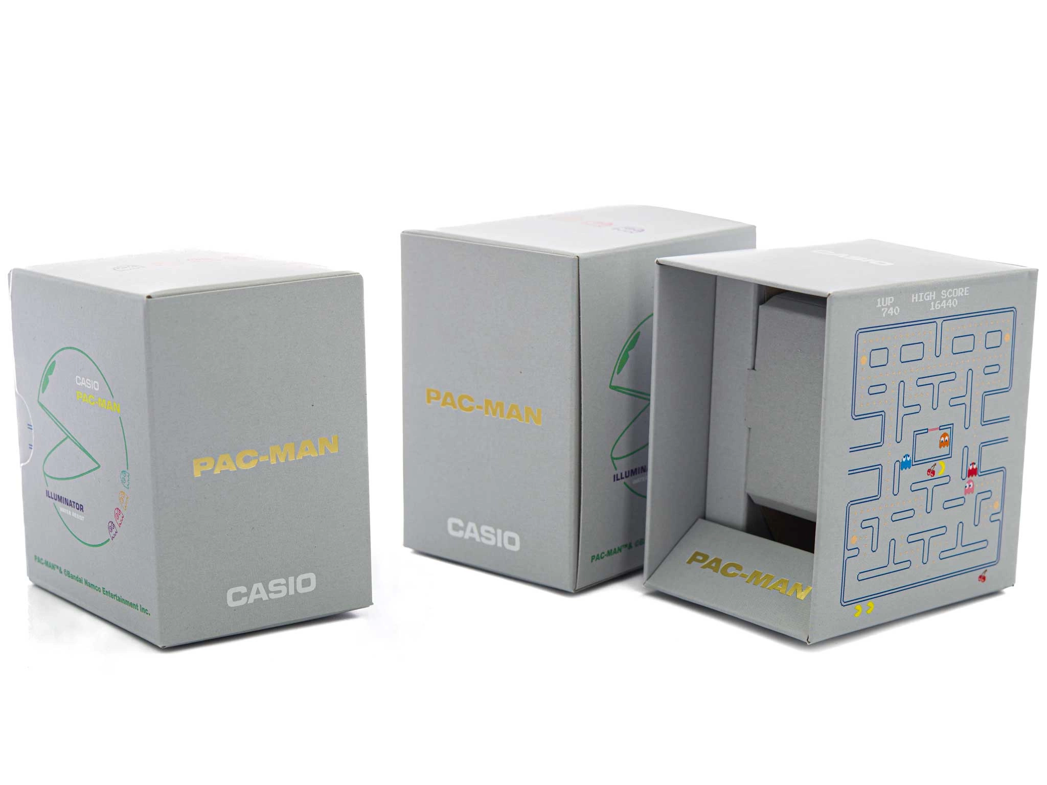 Na szczególną uwagę zasługuje podświetlany wyświetlacz LCD, na którym pojawia się kultowy napis „WAKA WAKA” – fonetyczne odzwierciedlenie dźwięku towarzyszącego PAC-MANOWI podczas zbierania punktów. Ten sam motyw, będący hołdem dla dźwiękowej identyfikacji gry, umieszczono również na metalowym zapięciu stalowej bransolety, która z kolei przywołuje stylistykę klasycznych zegarków Casio z końca XX wieku. Tył koperty zdobi subtelny grawerunek z postacią PAC-MANA oraz jego logo, co dodatkowo podkreśla kolekcjonerski charakter modelu i czyni go przedmiotem pożądania dla każdego entuzjasty gier wideo i designu.