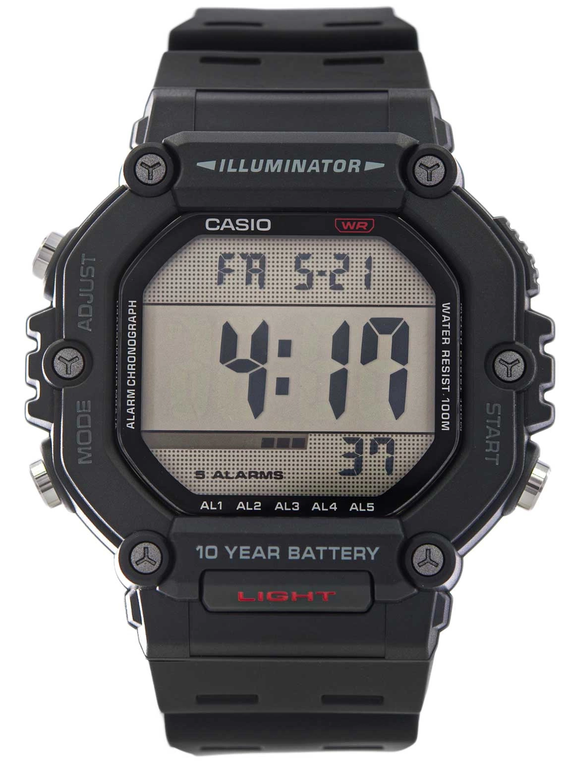 Casio AE-1600H-1AVEF to propozycja dla osób poszukujących zegarka, który łączy wyrazisty, męski design z rozbudowanymi funkcjami użytkowymi i długowiecznością. Model ten wyróżnia się dużą kopertą o szerokości 50 mm, wykonaną z odpornego na uszkodzenia tworzywa sztucznego w kolorze czarnym. Kształt koperty i jej geometryczne wykończenia nadają zegarkowi nowoczesny, techniczny charakter. Centralnym punktem konstrukcji jest wielkoformatowy wyświetlacz LCD, który dzięki swojej przejrzystej strukturze i dużym cyfrom umożliwia błyskawiczny odczyt czasu i wszystkich aktywnych funkcji, nawet w ruchu czy przy słabym świetle. Dodatkowo, na froncie obudowy umieszczono dedykowany przycisk uruchamiający podświetlenie LED – rozwiązanie niezwykle praktyczne, pozwalające na wygodne korzystanie z zegarka w ciemności. Jednym z głównych atutów tego modelu jest jego energooszczędność – zegarek zasilany jest baterią o żywotności do 10 lat, co praktycznie eliminuje potrzebę częstej wymiany źródła zasilania. Casio AE-1600H-1AVEF został również zaprojektowany z myślą o wysokiej odporności na warunki zewnętrzne. Wodoszczelność na poziomie 10 barów pozwala na bezpieczne użytkowanie zegarka podczas pływania, korzystania z prysznica czy w trudniejszych warunkach pogodowych. Akrylowe szkiełko zabezpiecza ekran zachowując jednocześnie elastyczność i niską wagę całej konstrukcji.