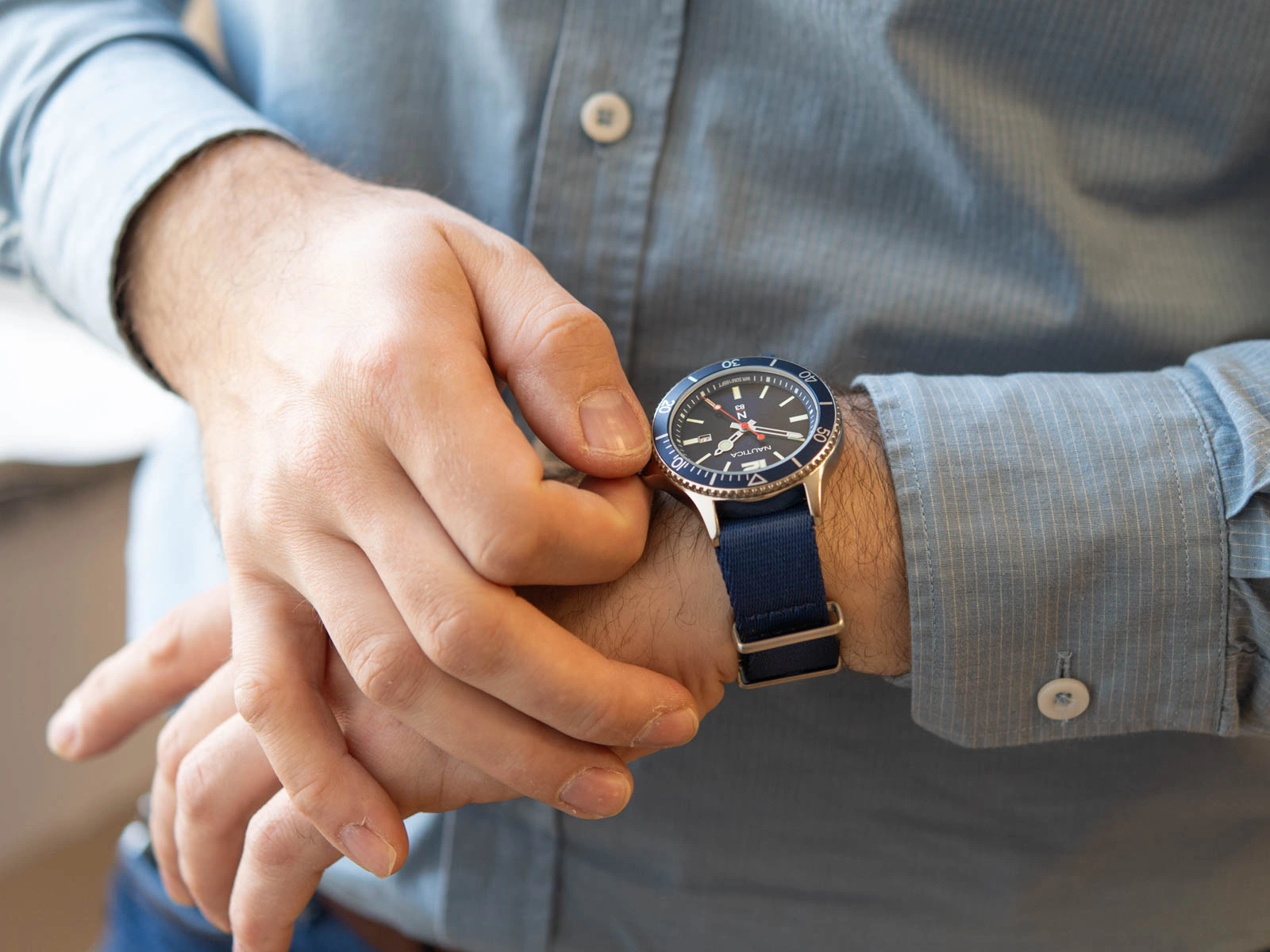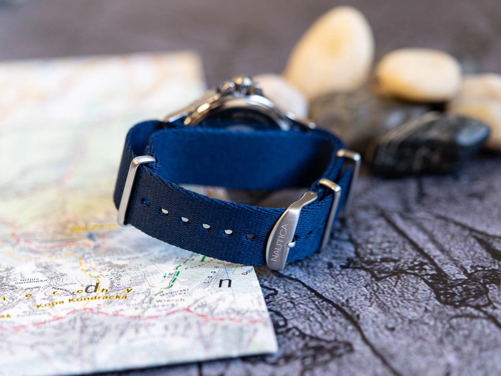 Nautica N83 Accra Beach NAPABS904 to uniwersalny zegarek, który z powodzeniem łączy codzienny styl z gotowością do działania w dynamicznych warunkach. Jego konstrukcja opiera się na precyzyjnym, japońskim mechanizmie kwarcowym zasilanym baterią, który umieszczono w solidnej metalowej kopercie zabezpieczonej wytrzymałym stalowym deklem. Model wyposażony został w granatowy pasek NATO – lekki, elastyczny i odporny na zużycie, doskonale sprawdzający się zarówno w miejskim otoczeniu, jak i podczas aktywności fizycznych. Granatowa tarcza z wyraźnymi indeksami i datownikiem przy godzinie trzeciej jest przejrzysta i funkcjonalna, a fosforyzujące powłoki na wskazówkach i indeksach (Neobrite) ułatwiają odczyt czasu po zmroku. Całość chroniona jest przez odporne na zarysowania szkło mineralne.