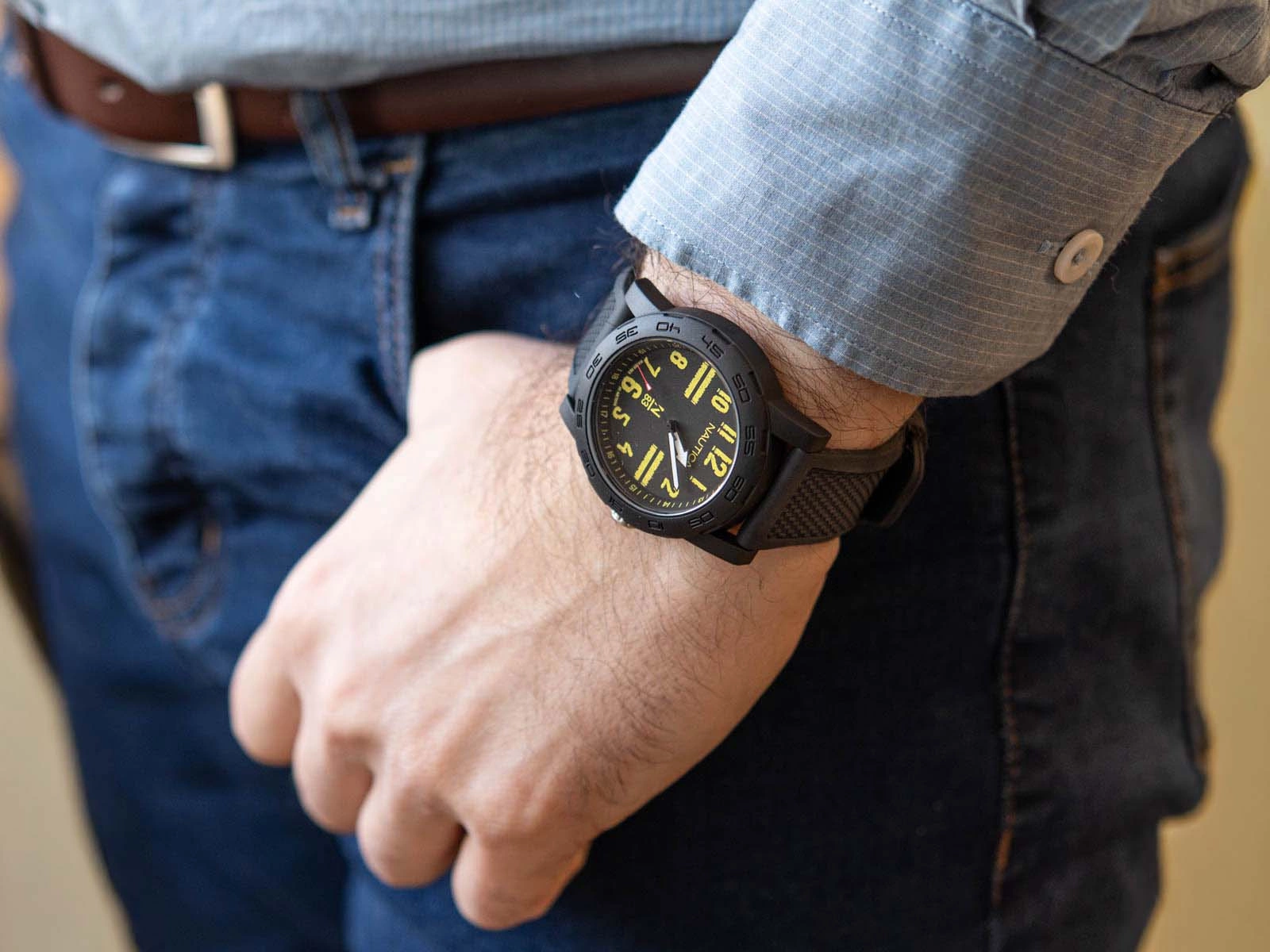 Nautica NAPATS303 M83 Aiya Triada to męski zegarek nowej generacji, który idealnie łączy sportowy styl z troską o środowisko i precyzyjnym działaniem. Dominująca czerń obudowy i paska, uzupełniona wyrazistymi żółtymi detalami na tarczy, nadaje temu modelowi dynamicznego, nowoczesnego wyglądu, idealnego zarówno na co dzień, jak i w bardziej aktywnych sytuacjach. Zegarek został zaprojektowany z myślą o ekologii – jego koperta i pasek wykonane są z zaawansowanego, przyjaznego dla środowiska tworzywa, które nie tylko redukuje wpływ produkcji na planetę, ale jest także lekkie, wytrzymałe i komfortowe w codziennym użytkowaniu. Dodatkowo zastosowano elementy ceramiczne, co nadaje konstrukcji elegancji i trwałości.