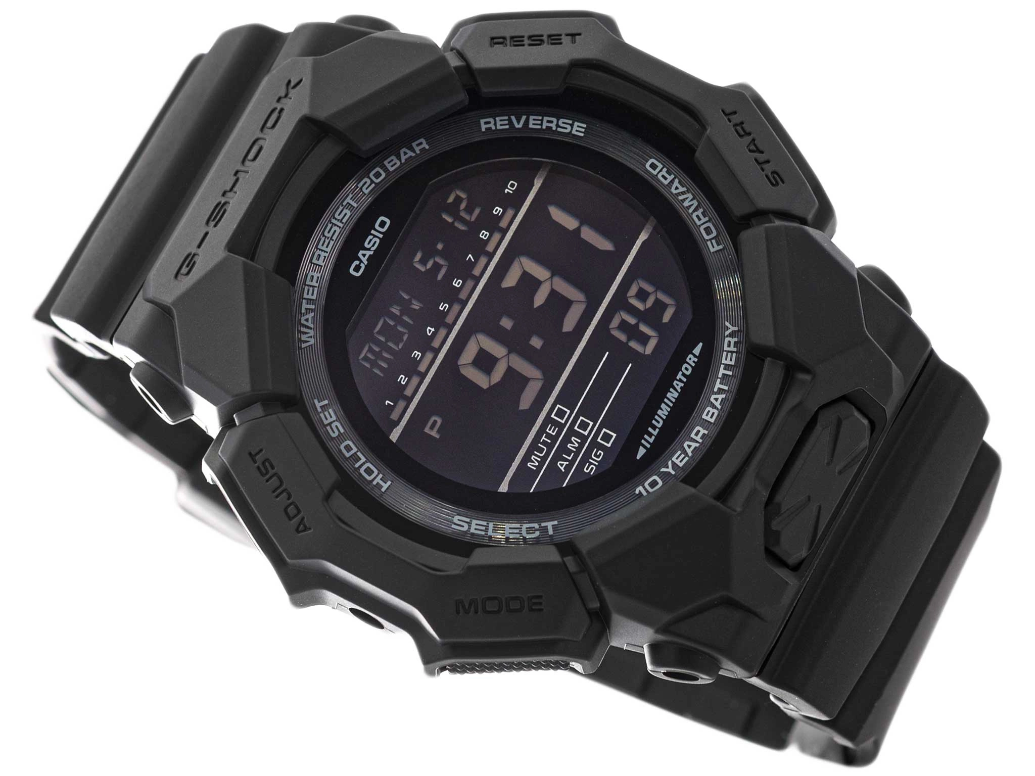 - Wodoszczelny Zegarek Męski Casio G-SHOCK GD-010 1A1ER czarny na pasku, posiada funkcje takie jak stoper i datownik.