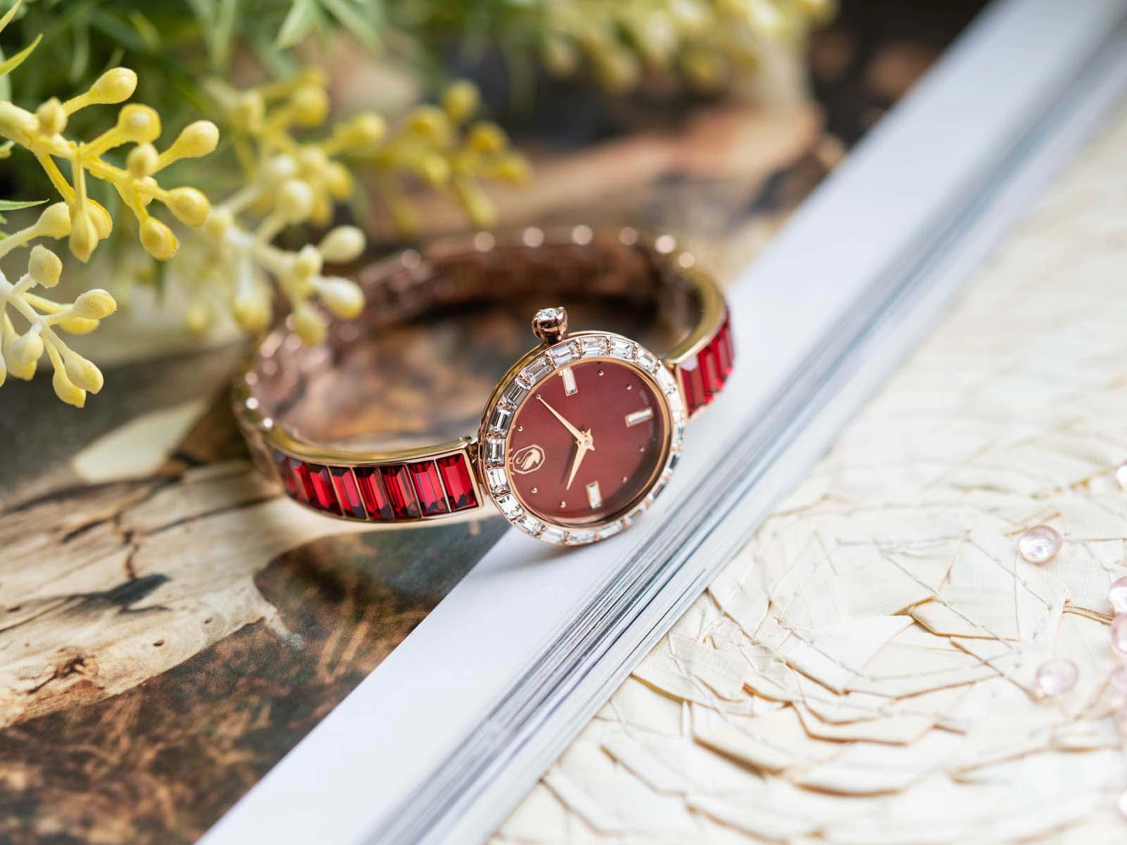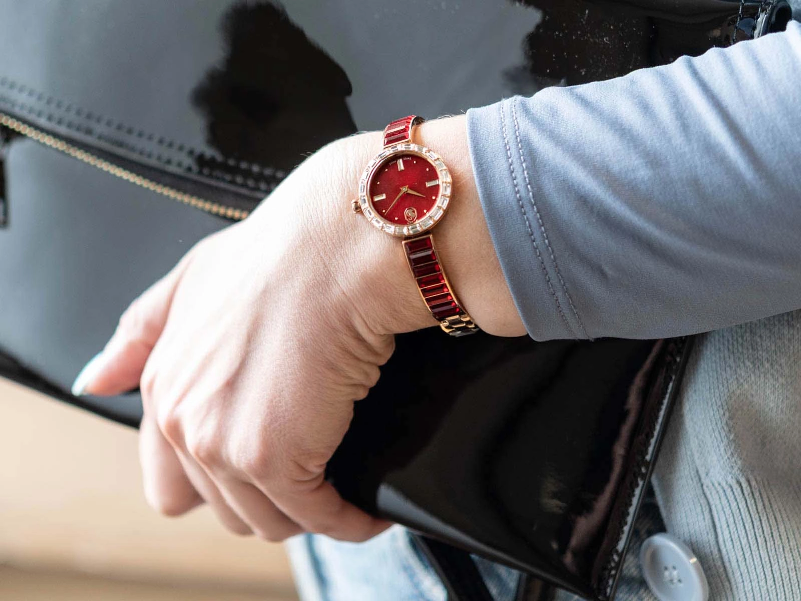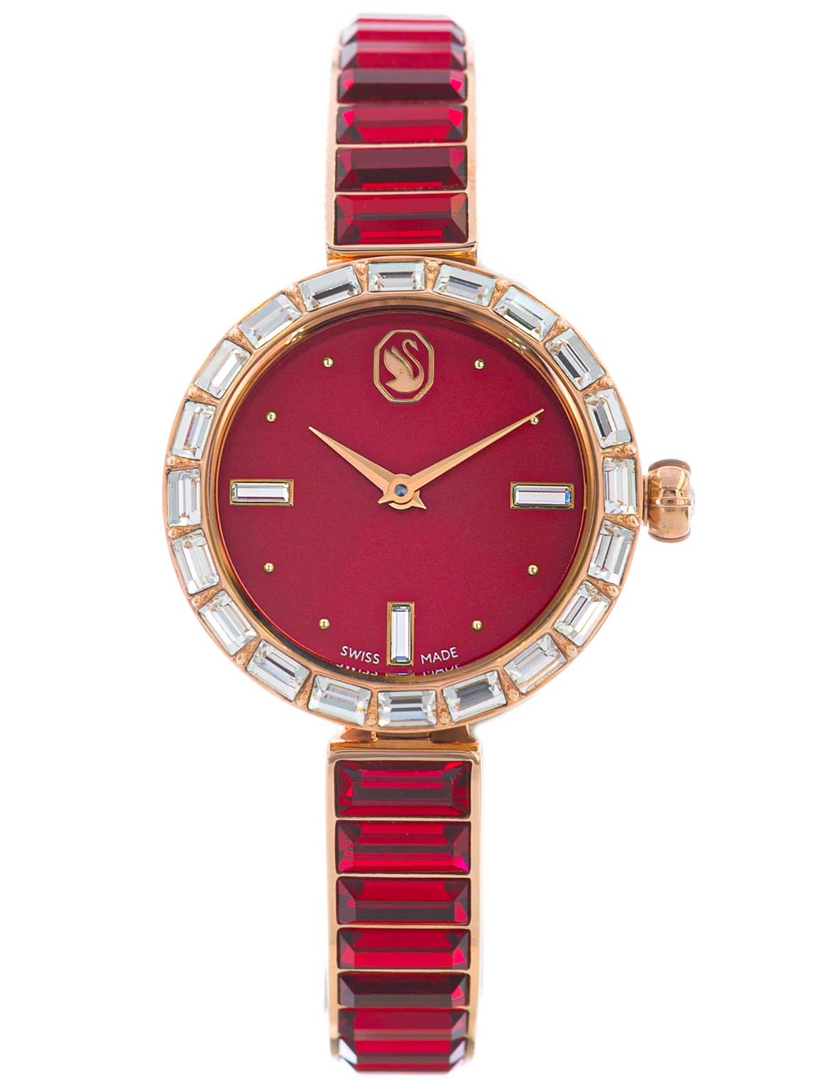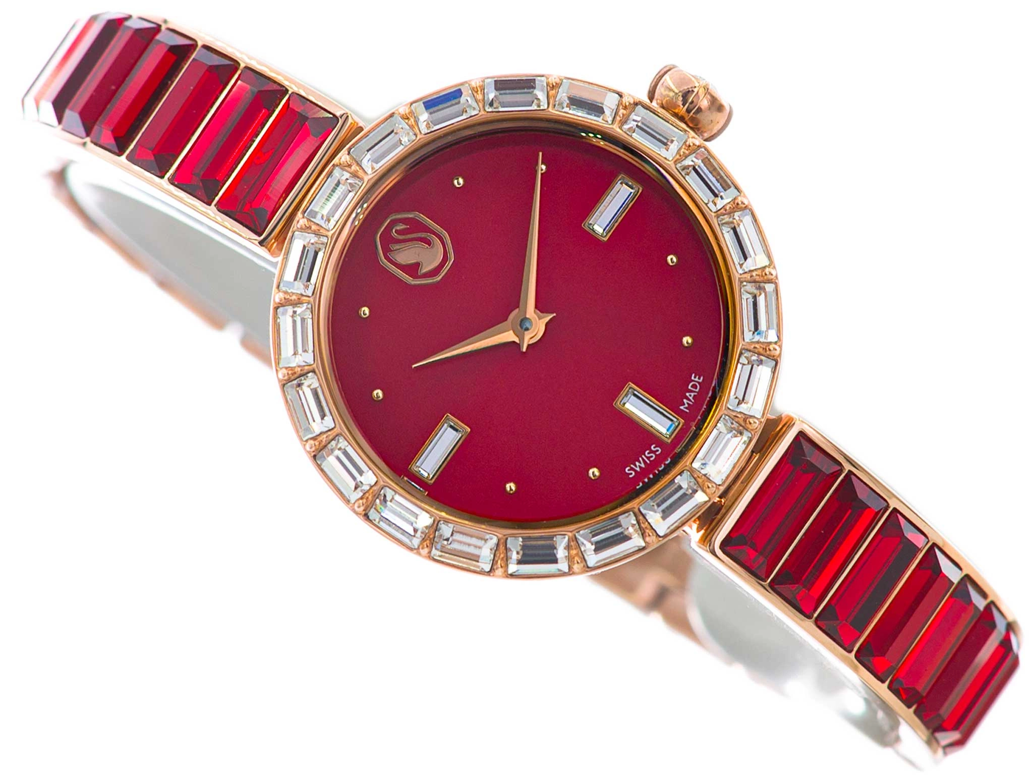Jednym z najbardziej charakterystycznych elementów tego modelu jest intensywnie czerwona tarcza — odważna, wyrazista i niezwykle stylowa. Na godzinie 12 dumnie prezentuje się logo Swarovski w formie łabędzia, będącego znakiem rozpoznawczym marki. Tarcza otoczona jest okrągłym pierścieniem ozdobionym aż 20 podłużnymi kryształkami, które pięknie odbijają światło, nadając zegarkowi teatralnego uroku i biżuteryjnego blasku. Dodatkowym detalem, który zasługuje na uwagę, jest delikatny kryształ osadzony w koronce — to niewielki, ale znaczący akcent, który potęguje wrażenie luksusu. Czasomierz dostarczany jest w eleganckim, firmowym opakowaniu, co czyni go idealnym wyborem na prezent — zarówno dla kogoś bliskiego, jak i dla siebie samej, jako forma nagrody lub celebracji wyjątkowej chwili.