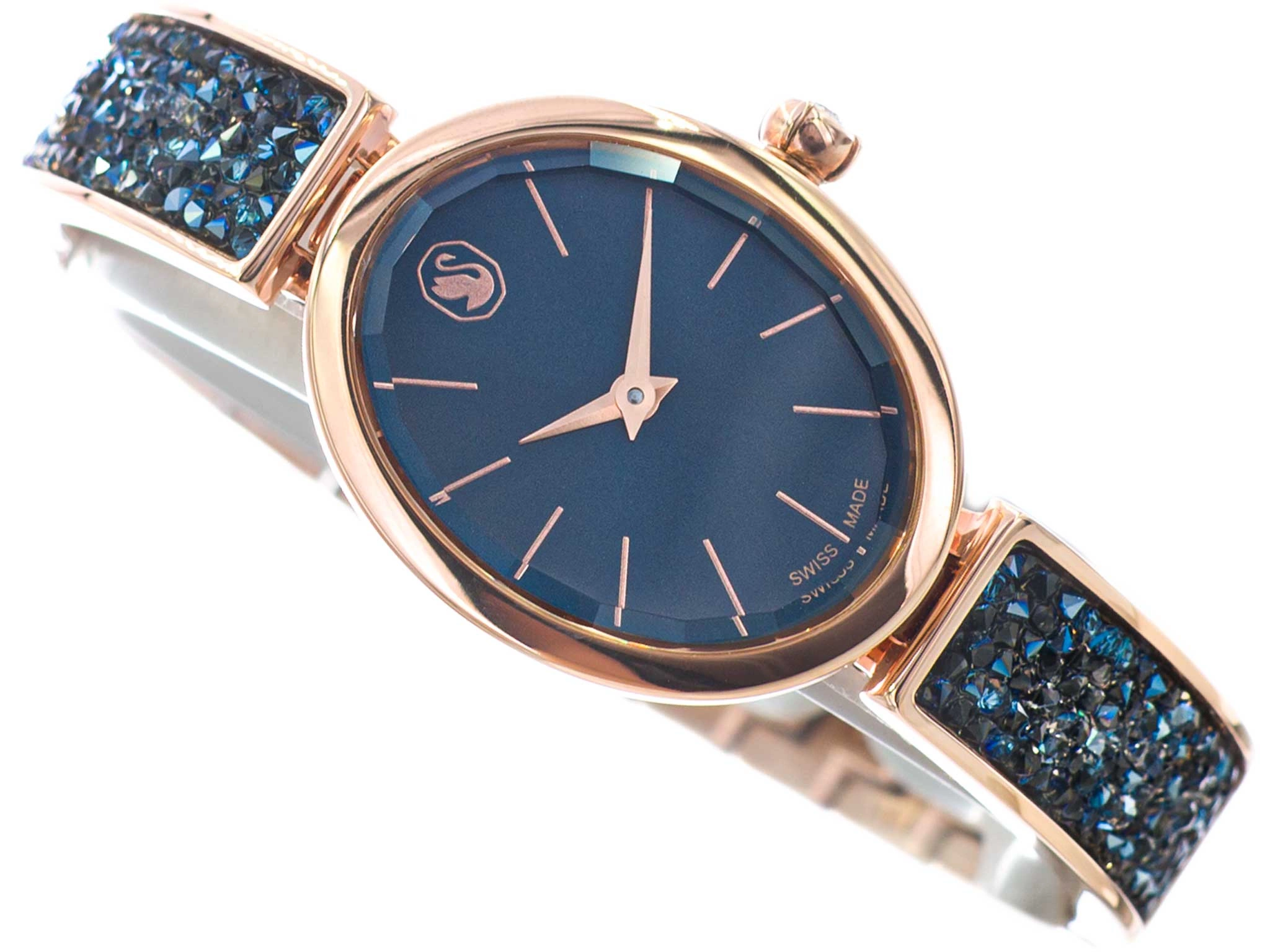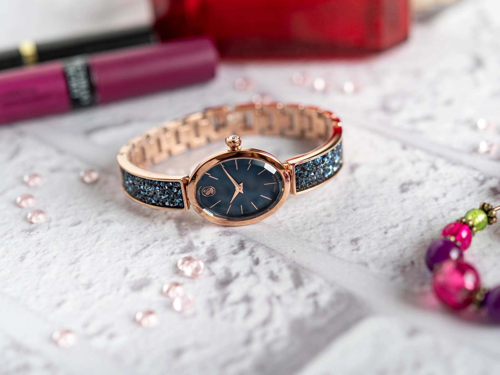 Swarovski Crystal Rock Oval 5656822 to elegancki zegarek damski, który z wdziękiem łączy klasyczną formę z nowoczesnym wyrafinowaniem, będąc odzwierciedleniem charakterystycznej estetyki marki Swarovski. Projekt tego modelu wyróżnia się starannością wykonania i zamiłowaniem do detali. Koperta oraz bransoleta zostały wykonane z trwałej stali nierdzewnej i pokryte subtelnym odcieniem różowego złota, które wprowadza ciepło i wyrafinowanie do całej kompozycji. Szczególną uwagę przyciąga olśniewająca bransoleta ozdobiona około 232 niebieskimi kryształami, aplikowanymi z wykorzystaniem techniki Ultra Fine Crystal Rocks. Ten kontrastowy, błyszczący akcent wprowadza nowoczesny charakter i przyciąga wzrok, nadając zegarkowi wyjątkowego uroku. Granatowa tarcza o owalnym kształcie tworzy elegancki kontrast z oprawą w kolorze różowego złota. Na godzinie 12 umieszczono symbol łabędzia – rozpoznawalne logo Swarovski, symbolizujące piękno i doskonałość. Subtelny, osadzony w koronce kryształ stanowi wysmakowany detal, który dopełnia całość i dodaje zegarkowi luksusowego wyrazu.