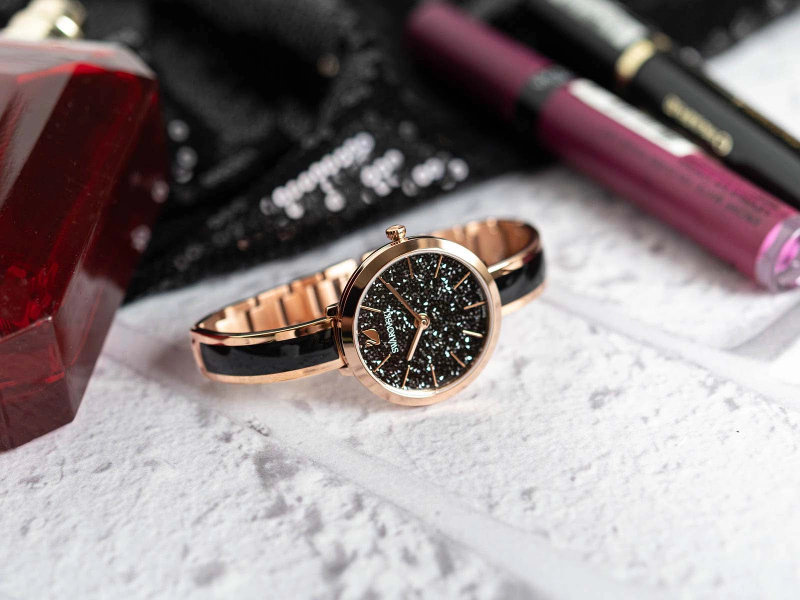 Swarovski Crystalline Delight 5580530 to wyrafinowany zegarek damski, który harmonijnie łączy klasyczną elegancję z nowoczesnym designem, oddając ducha luksusu i precyzji charakterystycznego dla marki Swarovski. Projekt zachwyca dbałością o detale oraz wyjątkowym wykończeniem, które przyciąga uwagę już od pierwszego spojrzenia. Koperta i bransoleta zegarka wykonane zostały z wysokiej jakości stali nierdzewnej i pokryte delikatną powłoką w odcieniu różowego złota, dodając całości subtelnego blasku i kobiecego uroku. Kontrastowa czarna wstawka na bransolecie nadaje całości nowoczesnego charakteru i przełamuje klasyczne tonacje. Prawdziwą ozdobą modelu jest tarcza zdobiona około 1000 czarnymi kryształkami Swarovski, które tworzą efekt lśniącej mozaiki, zmieniającej swój wygląd w zależności od kąta padania światła.
