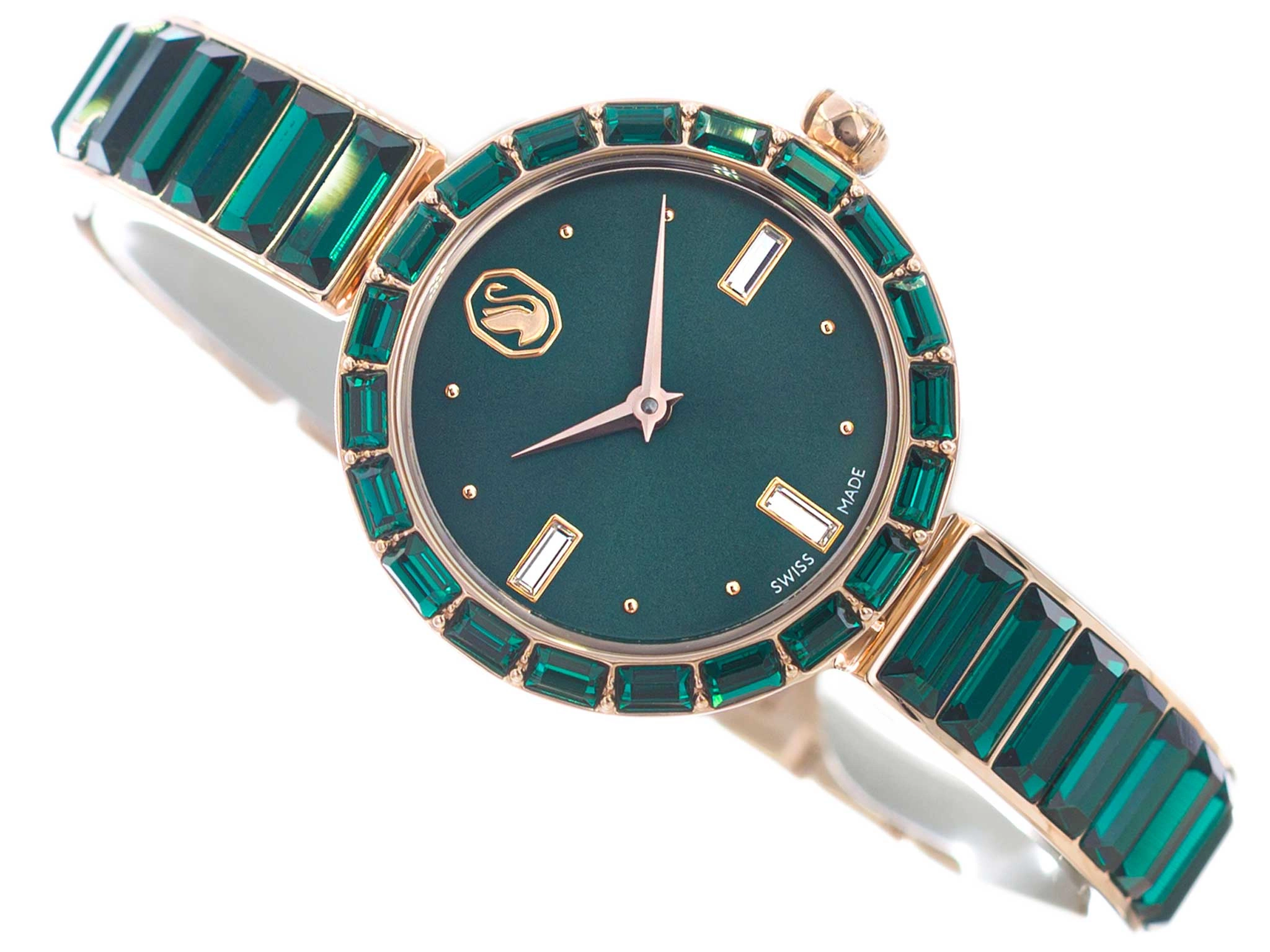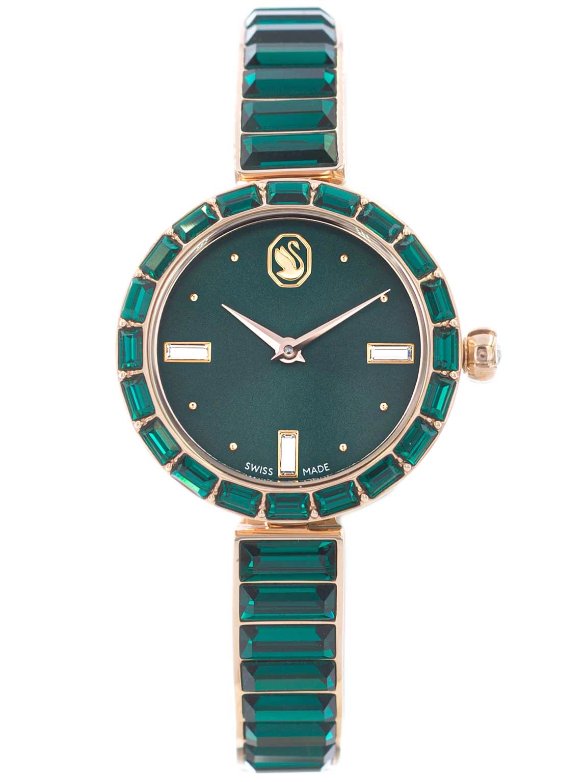 W sercu zegarka znajduje się precyzyjny mechanizm kwarcowy, zasilany baterią – gwarancja niezawodnego pomiaru czasu. Oznaczenie „Swiss Made” świadczy o najwyższej jakości i szwajcarskiej precyzji, które od lat stanowią synonim zegarmistrzowskiego kunsztu. Wyjątkowa zielona tarcza przyciąga wzrok swoją głębią i elegancją. Na jej szczycie umieszczono rozpoznawalne logo Swarovski – łabędzia, będącego symbolem klasy i wyrafinowania. Tarcza otoczona została pierścieniem zdobionym dwudziestoma smukłymi kryształkami, które efektownie odbijają światło, dodając zegarkowi biżuteryjnego blasku. Uwagę przyciąga również subtelny kryształ osadzony w koronce – detal, który podkreśla luksusowy charakter modelu. Zegarek zapakowany jest w gustowne, firmowe pudełko, co czyni go znakomitym pomysłem na prezent – zarówno dla ukochanej osoby, jak i dla siebie, jako forma nagrody lub pamiątka wyjątkowego momentu.