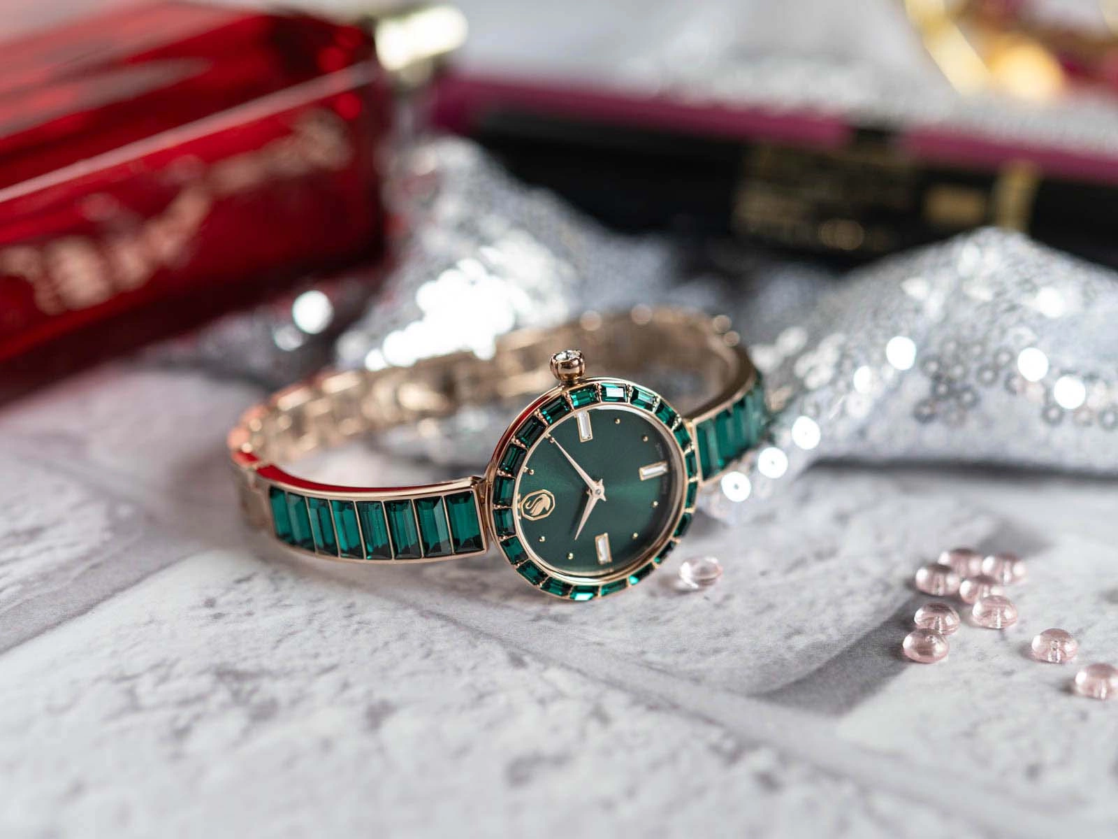 Swarovski Matrix Bangle 5690808 to elegancki zegarek damski, który zachwyca harmonijnym połączeniem klasycznej formy i współczesnego designu z wyraźnym, luksusowym akcentem, tak charakterystycznym dla marki Swarovski. Ten model to prawdziwa biżuteryjna perełka, zaprojektowana z myślą o kobietach ceniących zarówno estetykę, jak i precyzję wykonania. Solidna koperta oraz dopasowana bransoleta zostały wykonane z trwałej stali nierdzewnej i pokryte stylowym odcieniem szampańskiego złota. Ciepły połysk tego koloru nadaje zegarkowi subtelnego uroku, który sprawdzi się zarówno na co dzień, jak i podczas wyjątkowych okazji. Zielone kryształy, umieszczone na części bransolety, tworzą wyrazisty kontrast, który dodaje całości charakteru i nowoczesnego stylu.