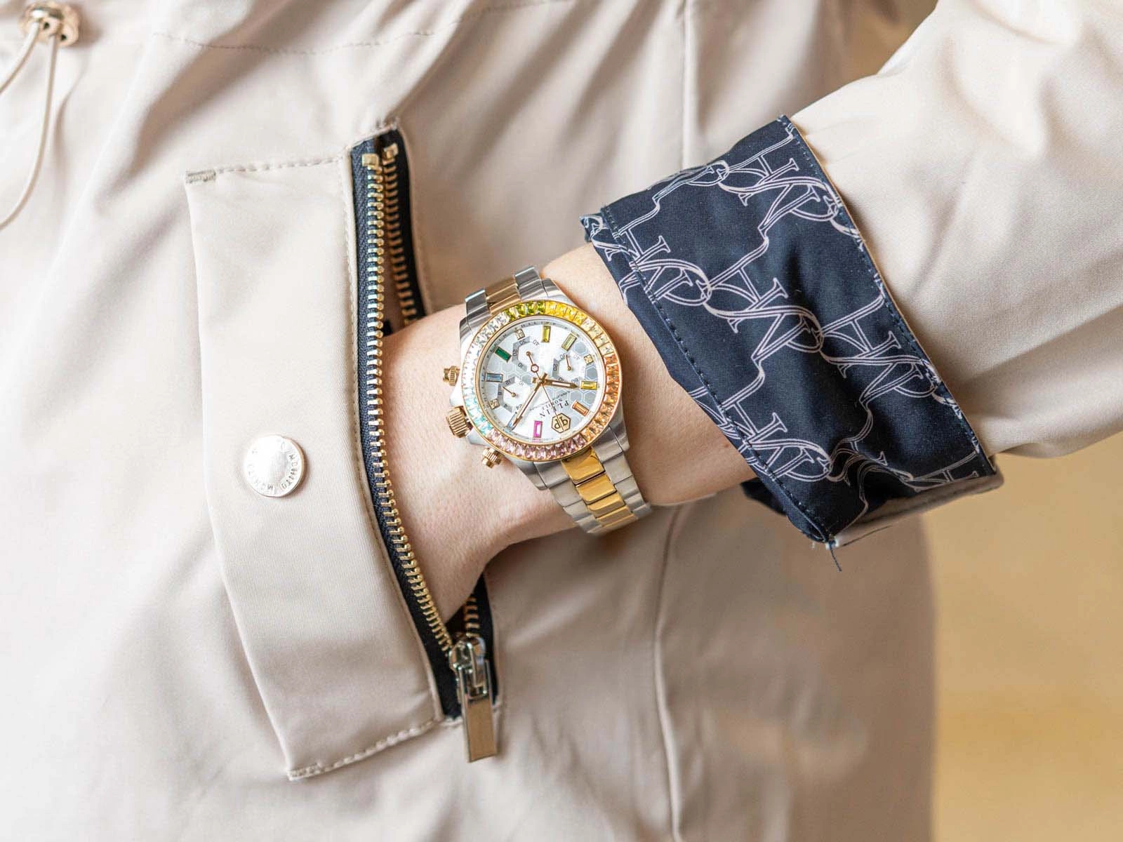 Philipp Plein PWSBA0523 Lady Chrono Street Couture to wyjątkowy zegarek stworzony z myślą o kobietach, które cenią sobie nie tylko funkcjonalność, ale także wyrafinowany styl i biżuteryjne wykończenie. Ten model to nie tylko narzędzie do mierzenia czasu, lecz przede wszystkim wyraz luksusu i odwagi w modzie – dokładnie w duchu marki Philipp Plein.Już na pierwszy rzut oka uwagę przyciąga masywna koperta, bogato zdobiona kolorowymi kryształkami, które lśnią przy każdym ruchu nadgarstka. Ich wielobarwny blask wspaniale komponuje się z elegancką tarczą w srebrnym odcieniu, ozdobioną subtelnym wzorem rombów. Indeksy godzinowe w formie połyskujących kryształków dodają całości biżuteryjnego charakteru i tworzą spójny, niezwykle kobiecy design.