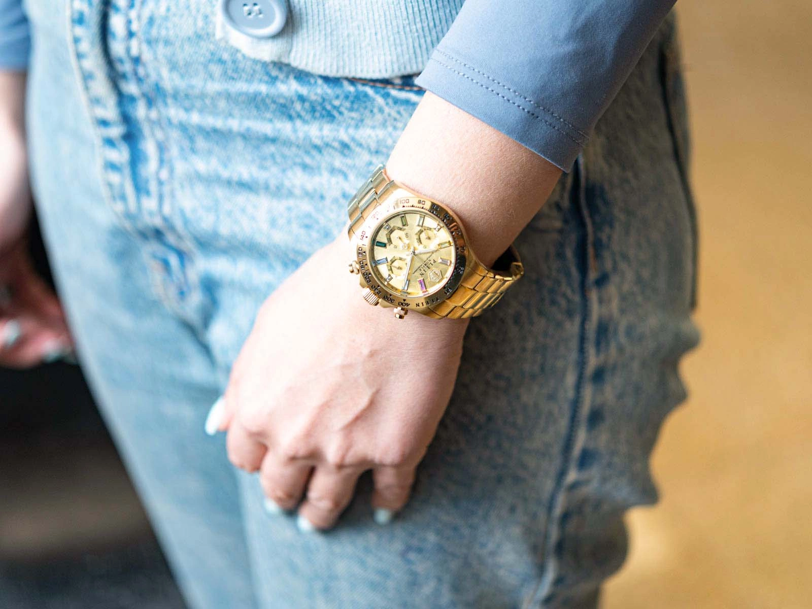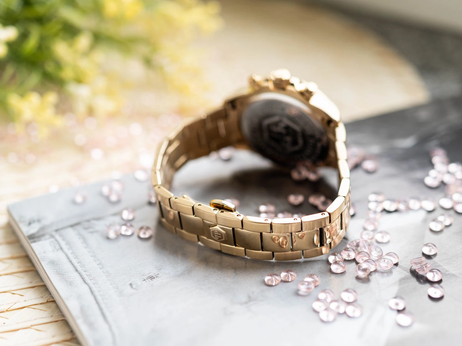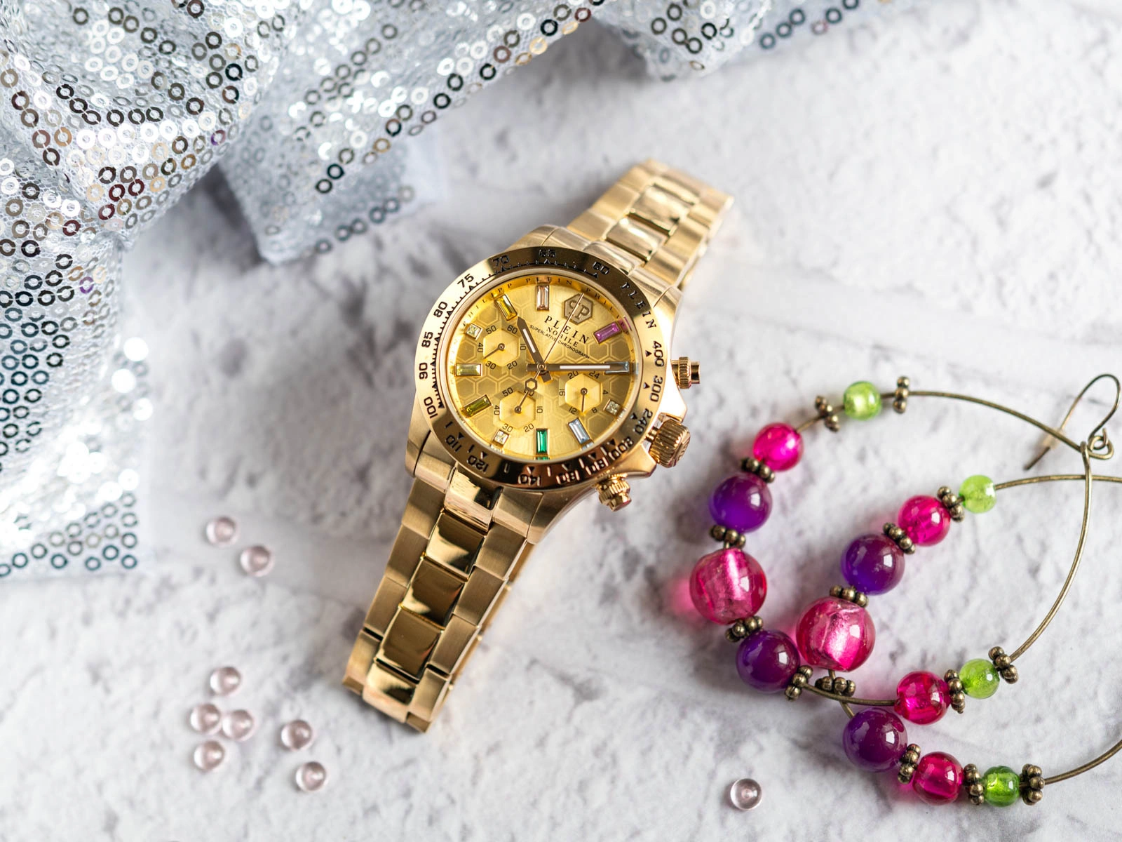Philipp Plein PWSBA0223 Nobile Lady to elegancki i pełen charakteru zegarek, zaprojektowany z myślą o kobietach, które pragną połączyć funkcjonalność z niepowtarzalnym, biżuteryjnym stylem. Ten model to coś więcej niż zwykły czasomierz – to modowe oświadczenie, zgodne z odważnym i luksusowym wizerunkiem marki Philipp Plein. Na pierwszy plan wysuwa się imponująca, złota koperta ze stylowym bezelem, która nadaje zegarkowi wyrazistości i elegancji. Tarcza zdobiona jest kolorowymi indeksami przypominającymi szlachetne kamienie – subtelny, a zarazem efektowny detal, który przyciąga spojrzenia. Zegarek łączy design z praktycznością – wyposażono go w funkcjonalne subtarcze: wskaźnik czasu 24-godzinnego oraz stoper, który sprawdzi się zarówno na co dzień, jak i podczas aktywności. Złota stalowa bransoleta z motylkowym zapięciem gwarantuje komfort noszenia i bezpieczeństwo użytkowania.