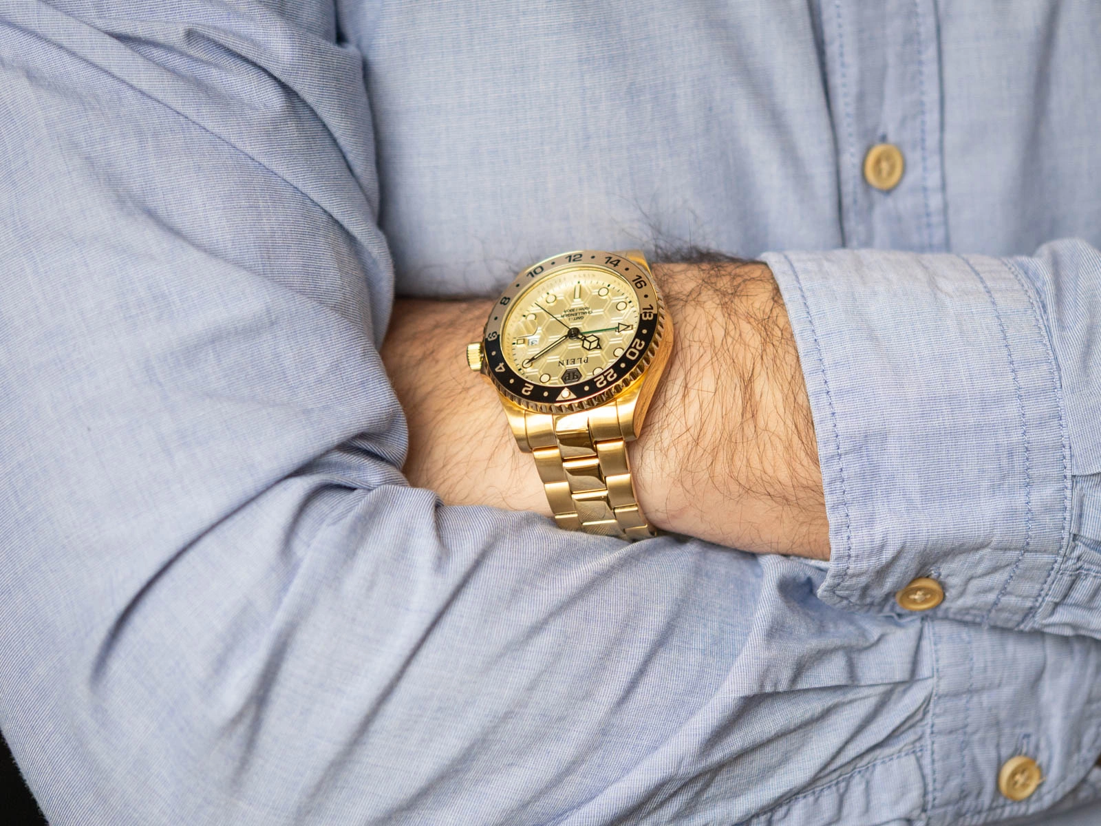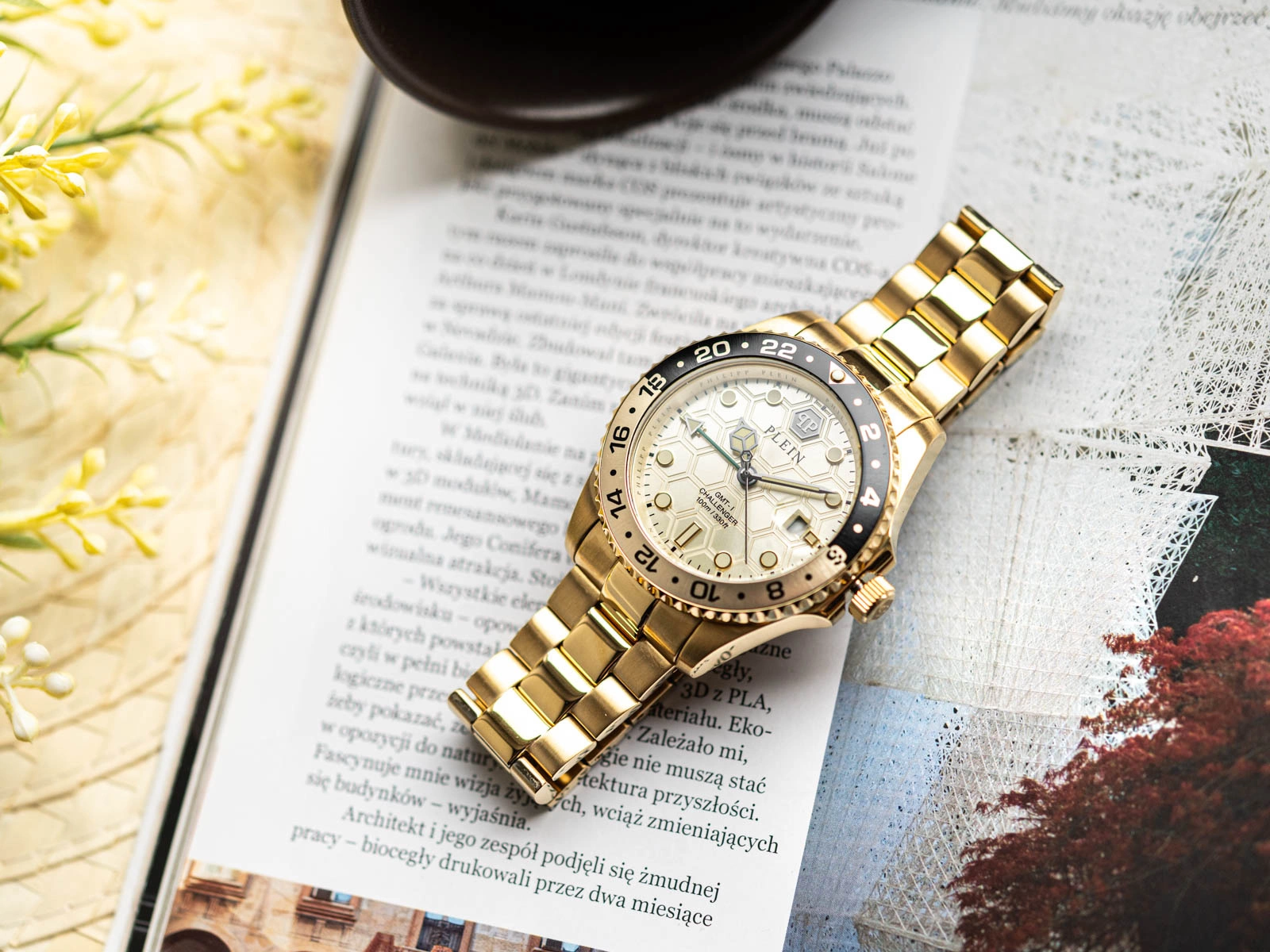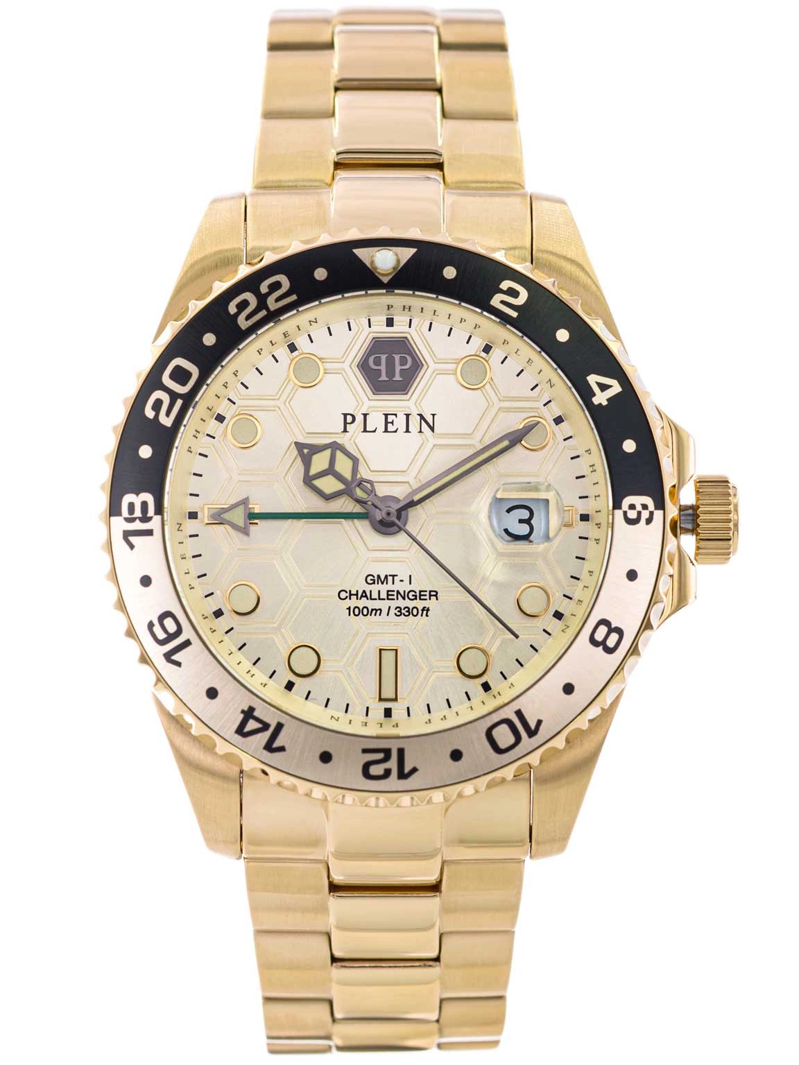 - Wodoszczelny Zegarek Philipp Plein PWYBA0423 złoty na bransolecie, posiada datownik i neobride.