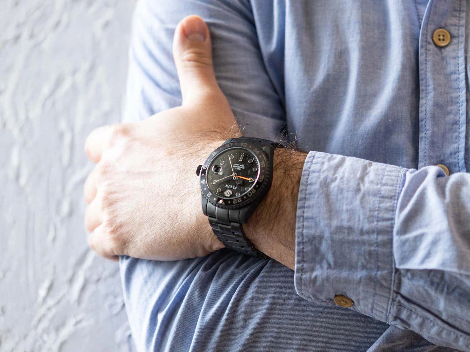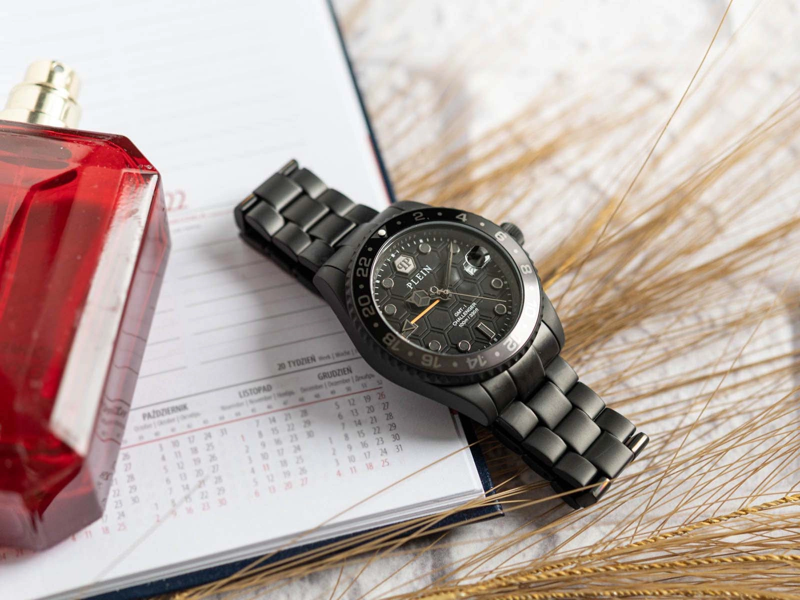 Philipp Plein PWYBA0923 GMT-I Challenger to zegarek zaprojektowany z myślą o mężczyznach, którzy cenią sobie wyrazisty styl, funkcjonalność i nowoczesny design. Model ten, utrzymany w jednolitej, głębokiej czerni, emanuje siłą i charakterem. Geometryczny wzór w romby na tarczy nadaje całości dynamicznego wyglądu, a praktyczny datownik z powiększającą lupką zapewnia łatwy odczyt dnia miesiąca. Na tarczy znajduje się również dodatkowa wskazówka GMT, która umożliwia śledzenie drugiej strefy czasowej – niezależnie ustawianej. To idealne rozwiązanie dla podróżników, biznesmenów pracujących w międzynarodowym środowisku, a także dla tych, którzy chcą być w stałym kontakcie z bliskimi przebywającymi w innej części świata. Dzięki tej funkcji zegarek nie tylko przyciąga wzrok, ale także staje się praktycznym narzędziem w codziennym życiu. Cyferblat chroni odporne na zarysowania, płaskie szkło mineralne. Na godzinie 12 dumnie prezentuje się logo Philipp Plein – wyrazisty znak rozpoznawczy marki.