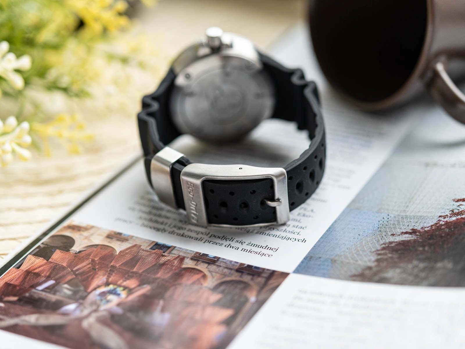 Pasek wykonano z trwałego, czarnego poliuretanu – tworzywa sztucznego odpornego na działanie wilgoci, soli i zmiennych temperatur. Jego elastyczna struktura oraz klasyczna sprzączka pozwalają na wygodne dopasowanie zegarka do nadgarstka, a dołączona przedłużka paska umożliwia komfortowe noszenie nawet na piance nurkowej. Całość zabezpiecza mineralne szkło, które chroni tarczę przed codziennymi uszkodzeniami mechanicznymi, nie tracąc przy tym klarowności optycznej. Dzięki wodoodporności na poziomie 300 metrów oraz zastosowaniu zakręcanej koronki i dekla, model ten spełnia normy ISO dla profesjonalnych zegarków nurkowych, gwarantując bezpieczeństwo użytkowania nawet podczas intensywnego zanurzenia.