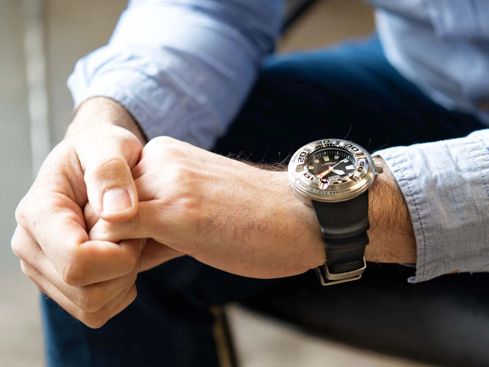 Solidna, masywna koperta o imponujących gabarytach wykonana została z wysokiej jakości stali szlachetnej, której srebrzysta powierzchnia harmonijnie kontrastuje z czernią detali oraz paskiem. Charakterystyczne, wyraźnie zaznaczone linie koperty oraz szerokie uszy podkreślają techniczny, narzędziowy charakter zegarka. Jednokierunkowy, obrotowy bezel z wyraźnie naciętymi krawędziami został zaprojektowany z myślą o łatwej obsłudze nawet w grubych rękawicach nurkowych. Jego funkcja pozwala na bezpieczne odmierzanie czasu zanurzenia, eliminując ryzyko przypadkowego wydłużenia nurkowania. Zintegrowany fosforyzujący marker umożliwia szybkie określenie pozycji w warunkach ograniczonej widoczności, co czyni zegarek niezwykle użytecznym podczas zanurzeń w głębokiej wodzie lub w nocy.