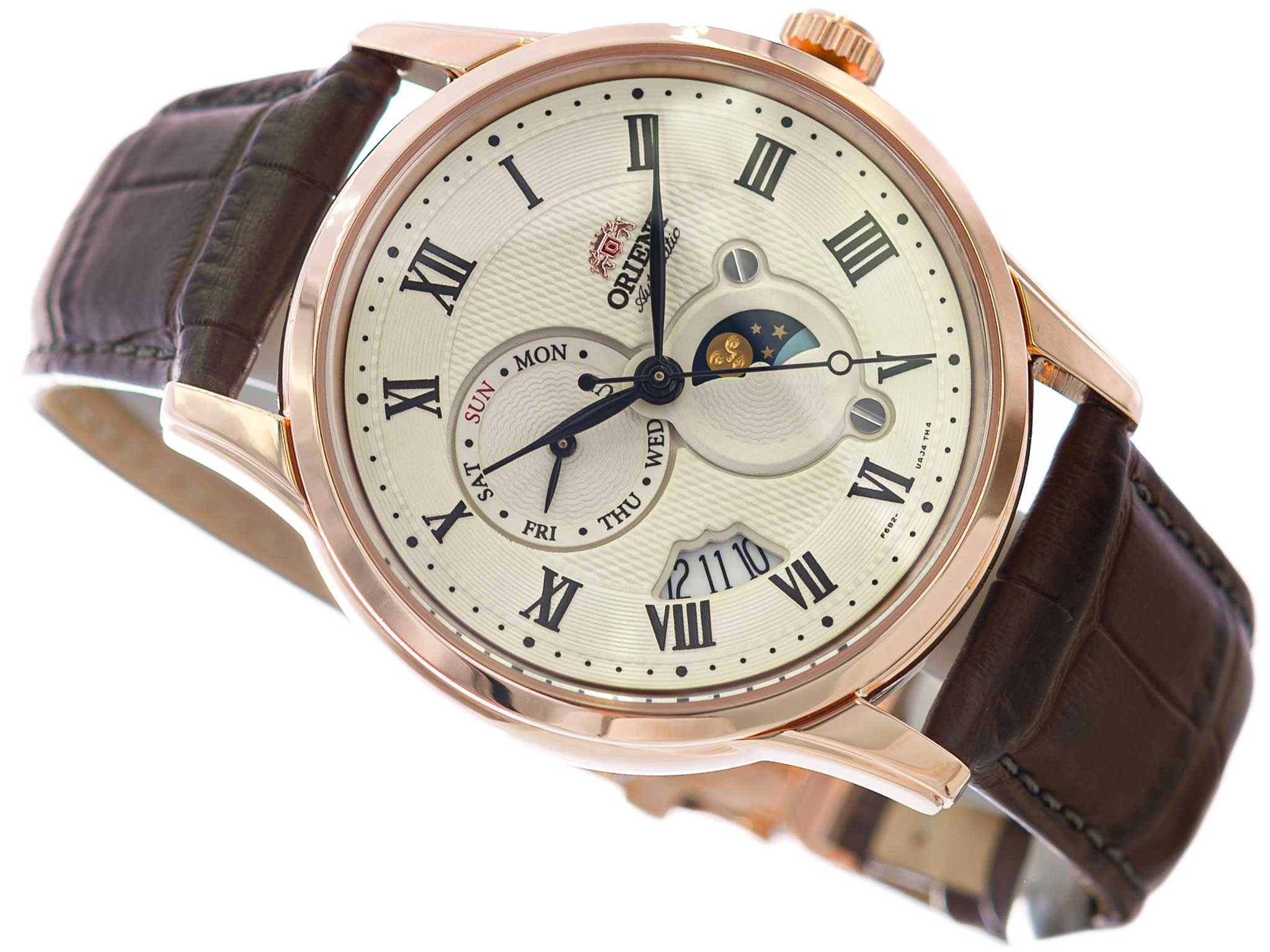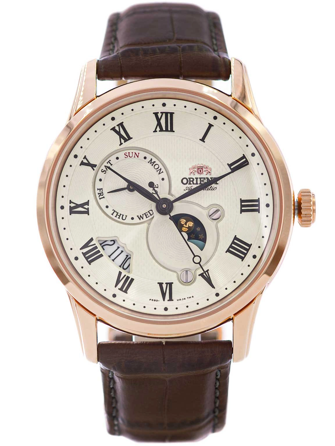 Orient RA-AK0007S30B Sun & Moon Automatic to wyrafinowany zegarek męski, który harmonijnie łączy elegancję klasyki z nowoczesnymi rozwiązaniami technicznymi. Jego sercem jest mechanizm automatyczny, który działa dzięki ruchom nadgarstka, eliminując potrzebę baterii. Dla jeszcze większej wygody użytkownika, zegarek wyposażono w możliwość ręcznego dokręcania za pomocą koronki, co zwiększa jego niezawodność i funkcjonalność na co dzień. Koperta wykonana została ze stali szlachetnej odpornej na korozję i wykończona eleganckim różowym złotem, co nadaje całości szlachetnego charakteru. Dopełnieniem jest brązowy pasek z naturalnej skóry, zapewniający komfort noszenia oraz trwałość nawet przy intensywnym użytkowaniu. Kremowa tarcza przyciąga wzrok subtelnym, a zarazem dopracowanym wzornictwem. Stylowe czarne cyfry rzymskie i smukłe wskazówki tworzą spójną całość z nowoczesnymi detalami, oferując przejrzystość i estetyczny balans.